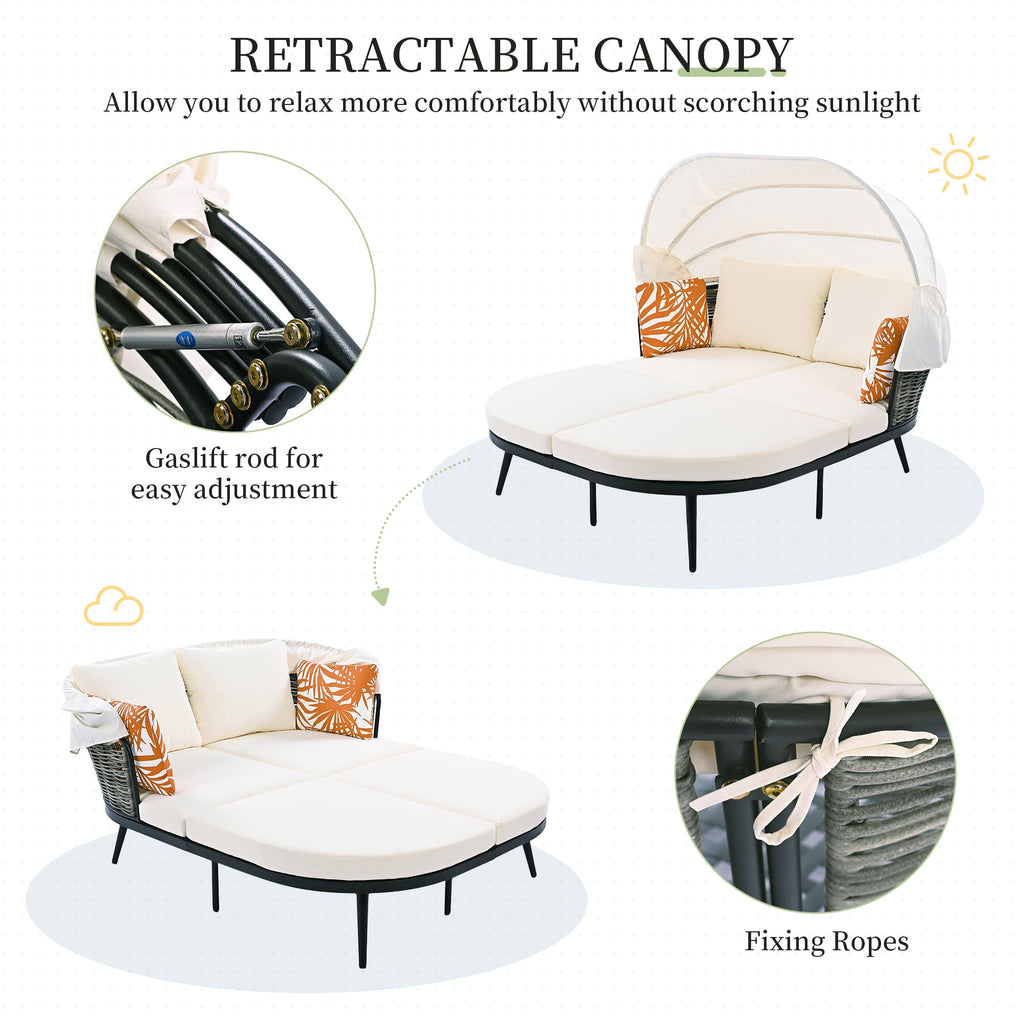 | Summary | Upgrade your outdoor lounging experience with our fashion patio daybed! Featuring a sturdy metal frame and a chic rattan back, this daybed comes with a retractable, gaslift-controlled canopy fixed by straps for customizable comfort. It includes four soft cushions with a 4-inch thickness, plus two back pillows and two colorful throw pillows for added flair. The cushion covers are easily washable, thanks to convenient zippers. Adjustable feet ensure stability on any surface, and a robust 700lbs weight capacity accommodates 2 people. Transform your patio into a relaxing retreat today! |