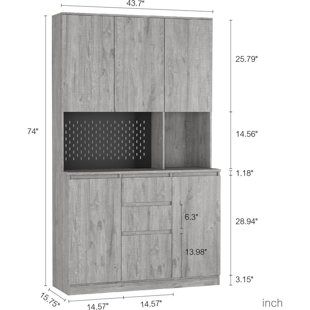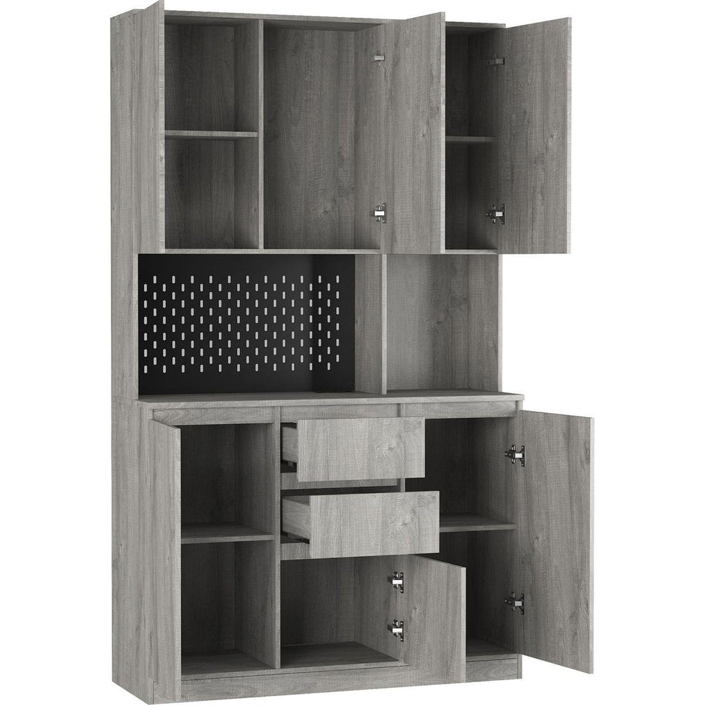 - Multiple door cupboards, a slide-out drawer for storing food or tableware, and an open grey countertop shelf for microwave oven, coffee maker, and more, provides an amazing amount of storage in this compact kitchen buffet server cabinet.