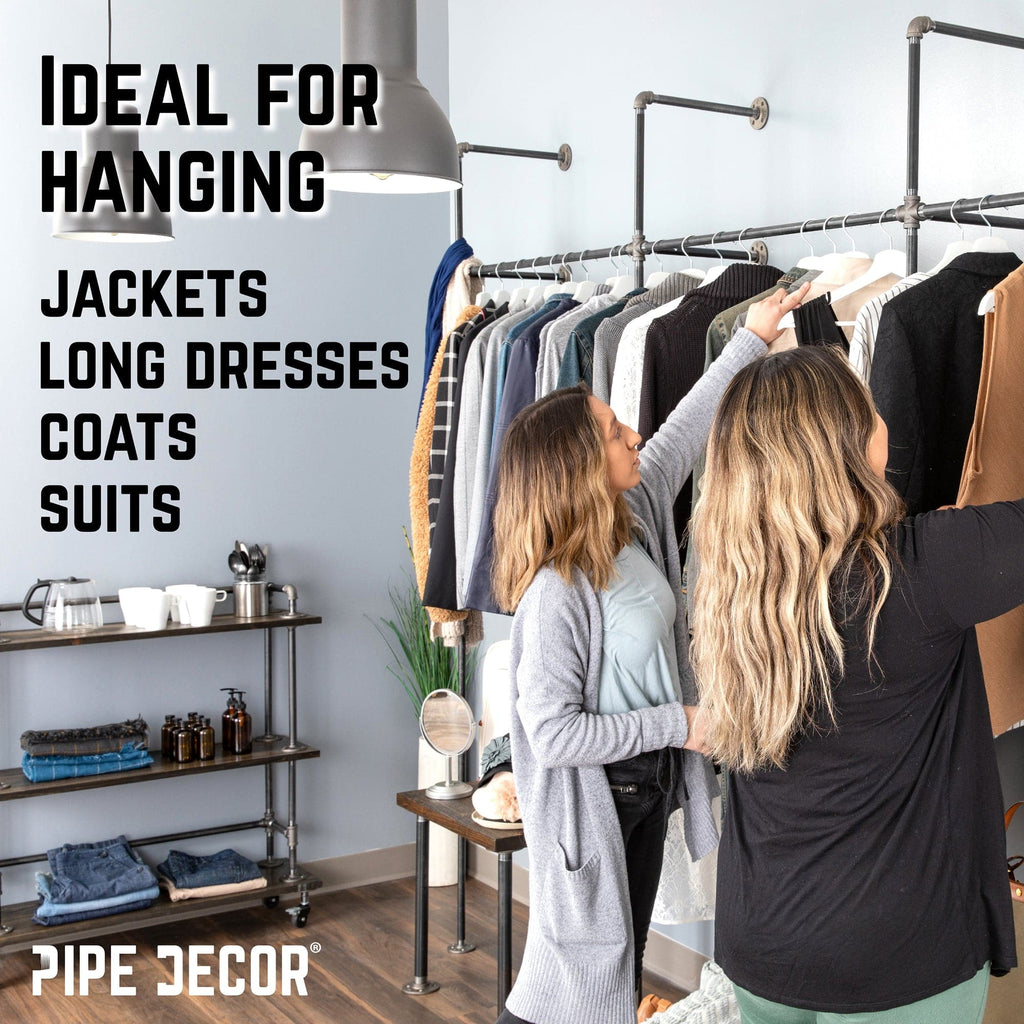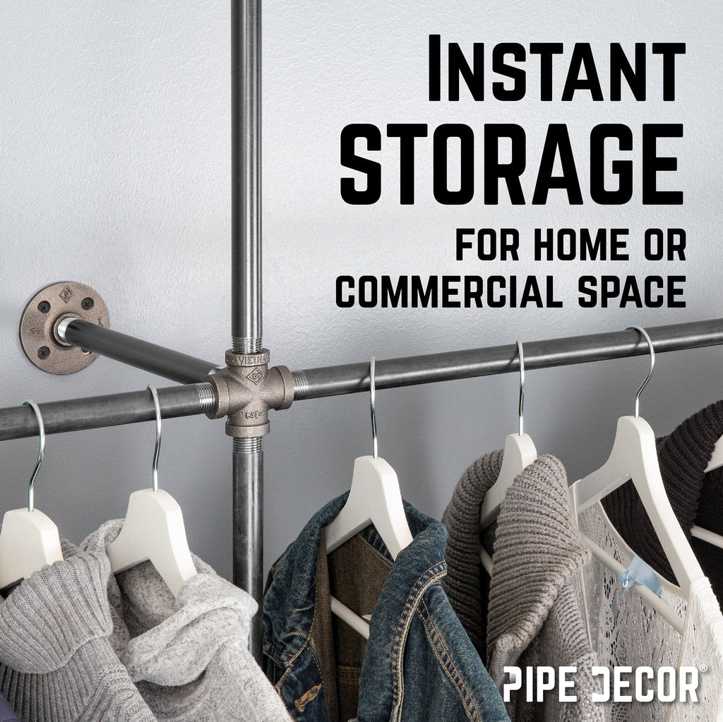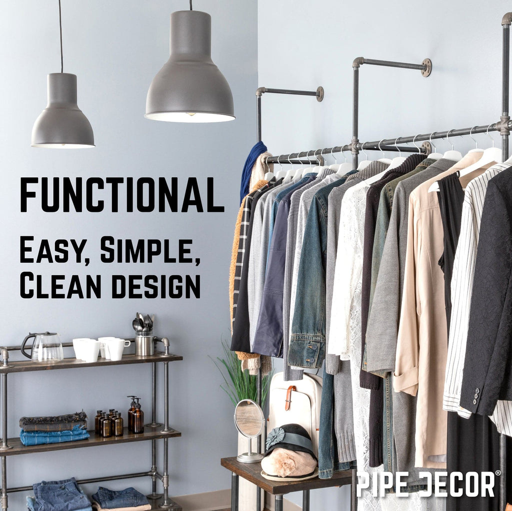 Minimalist design meets maximum functionality. Our expandable double-hung wardrobe is the perfect way to display your unique fashion sense in your home or shop. Mix and match our DIY kits to create the open wardrobe space of your dreams. Use your space efficiently by creating a one-of-a-kind wardrobe to get organized in a flash. Our wardrobe is modular and comes in sets of one, two, or three sections. Buy the size that fits your space. The pipes are 100% real steel and are made to stand the test of time. Our wardrobe anchors to the wall in multiple places for added stability using our patented 5-way fittings. Most of the weight is borne by the floor flanges, so you can install this design anywhere; however, we recommend drilling into a wall stud whenever possible for added stability.