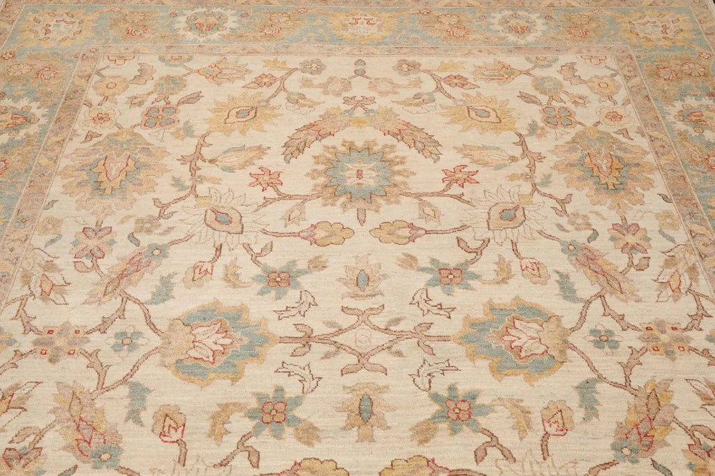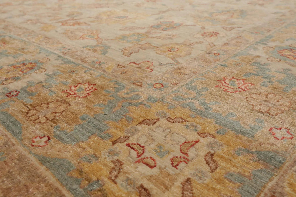 This is a beautiful Beige, Aqua, Gold Color Peshawar design Hand Knotted, Sino Persian Oriental 100% Wool Rug. Its elegant style is easy to decorate with and perfect for living room, dining room, bedroom or anywhere in the residence and office.