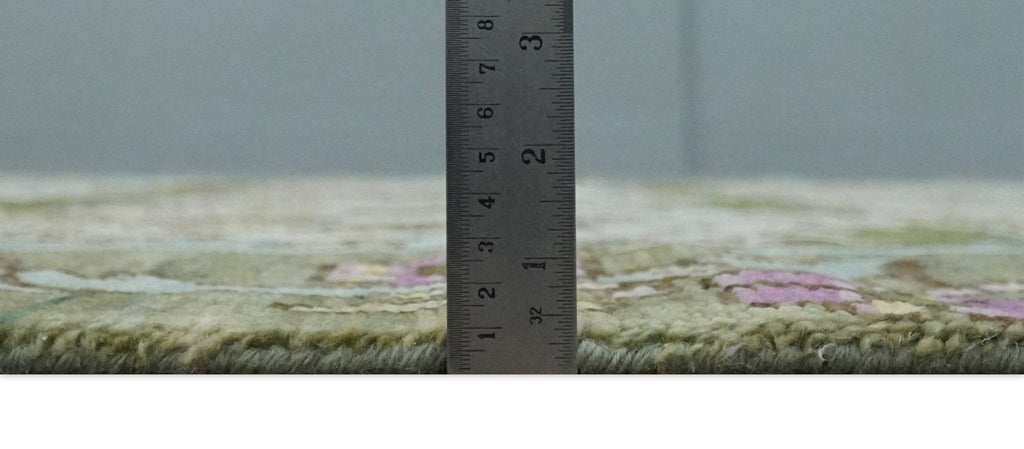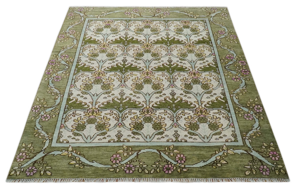 8.6x10 Hand Knotted Ivory and Green Floral Traditional Antique Style Wool Area Rug