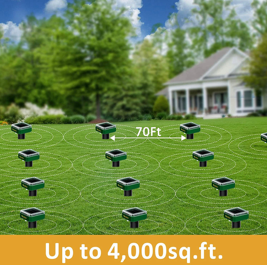 The solar mole repellent emits 2-second sonic pulses in every 30 seconds to the ground, which is a great annoyance to moles in an area of 5,000 sq.ft and effectively keeps them away.