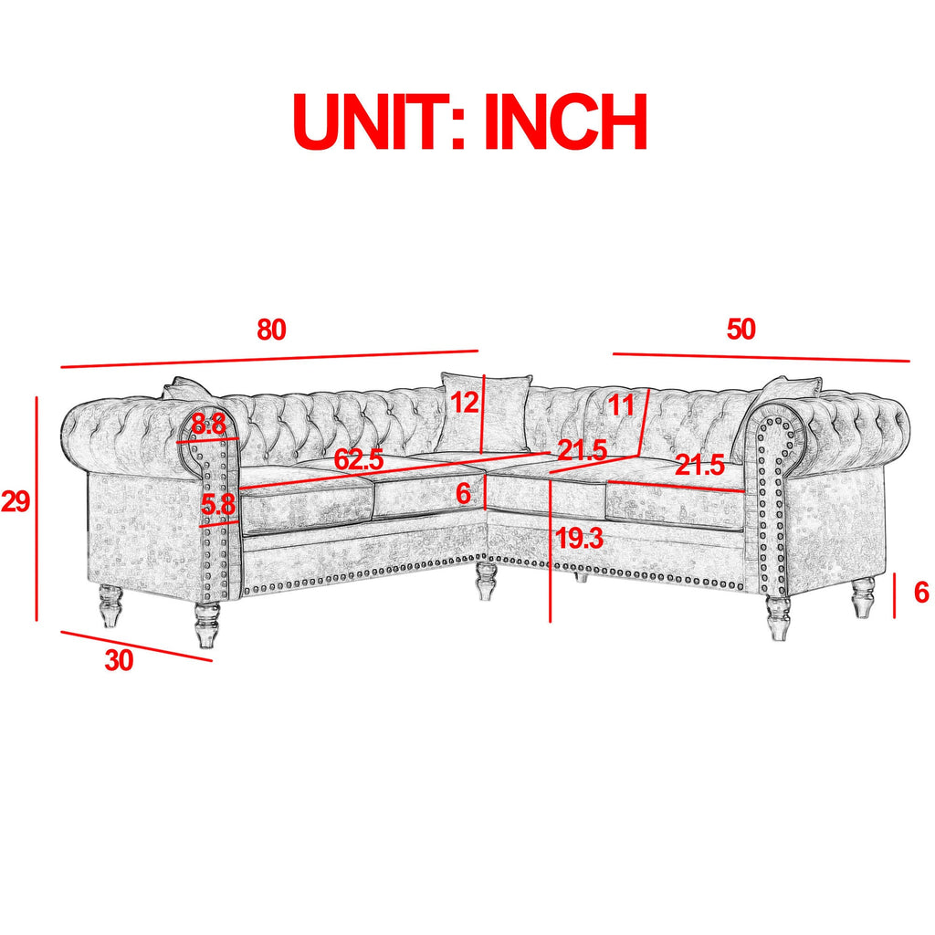MH 80" Deep Button Tufted Upholstered Roll Arm Luxury Classic Chesterfield L-shaped Sofa 3 Pillows Included, Solid Wood Gourd Legs, Grey velvet