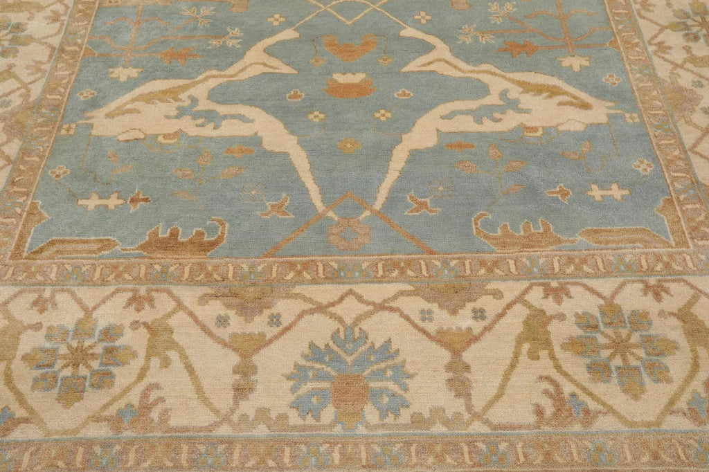 It has been produced using an identical weaving method and the design repertoire of the original Turkish Oushaks. Cosmopolitan and sophisticated in look, the rug has been handcrafted by artisans to a flawless composition. The main field comprising highly stylized floral and botanical elements is encompassed by a handsome multi-band border. The design of the border compliments the inner field and adds gentle grandeur to the artful composition of the rug. This rug representing an illustrious legacy of exquisite artistry and intricate craftsmanship is primed to add visual glamor and class to its surroundings. Its soft texture and timeless design make it ideal to enhance any space where it is placed.