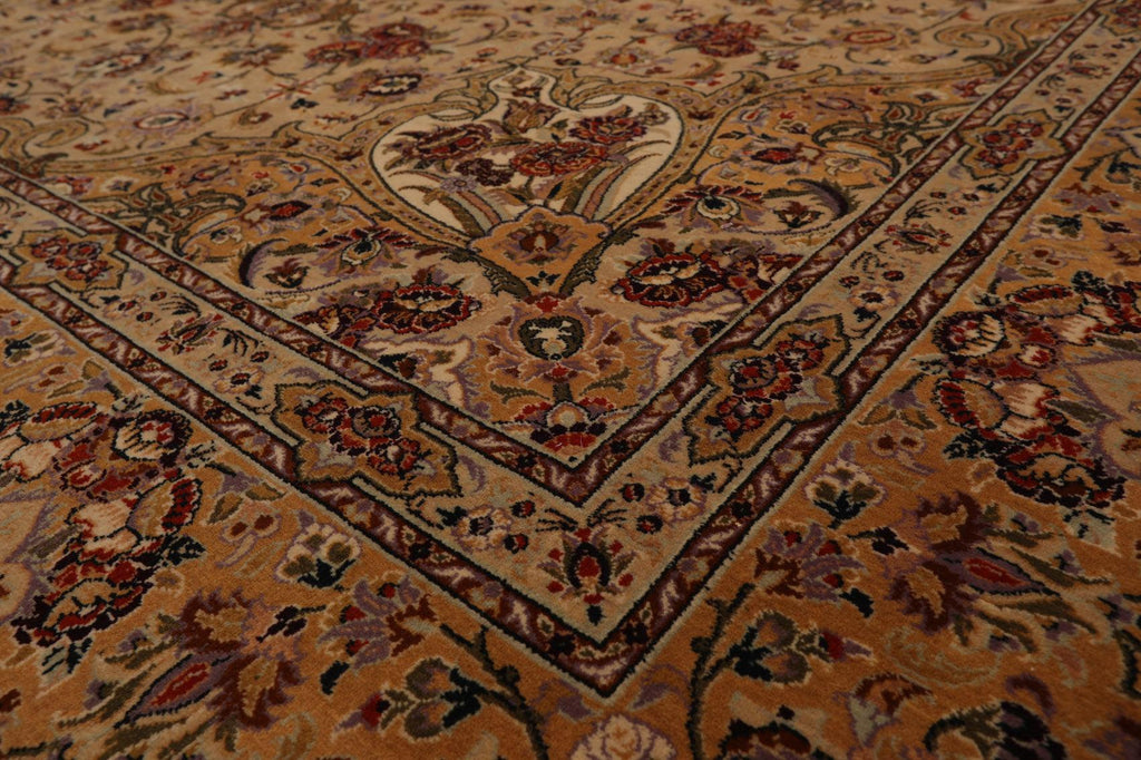Cosmopolitan and sophisticated in look, the rug has been hand crafted by artisans to a flawless composition. The main field comprising highly stylized floral and botanical elements is encompassed by a handsome multi-band border. The design of the border compliments the inner field and adds gentle grandeur to the artful composition of the rug. This rug representing an illustrious legacy of exquisite artistry and intricate craftsmanship is primed to add visual glamor and class to its surroundings. Its soft texture and timeless design make it ideal to enhance any space where it is placed.