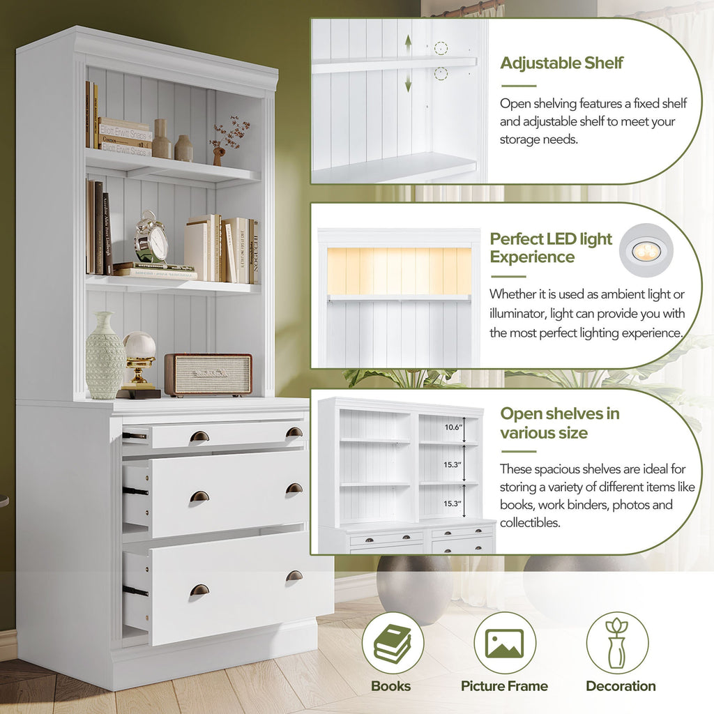 83.4"Tall Bookshelf Suite,Modern Bookcase Suite with LED Lighting, Drawers and Open Shelves,2-Piece Set Storage Bookshelf for Living Room,Home Office,White