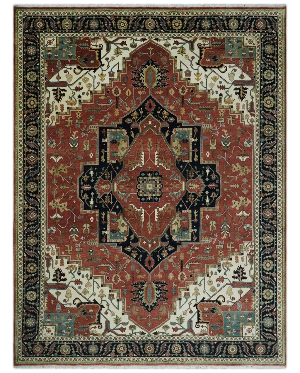8x10 and 9x12 Wool Hand Knotted Heriz Serapi Black, Rust and Ivory Floral Area Rug | TRDCP1063