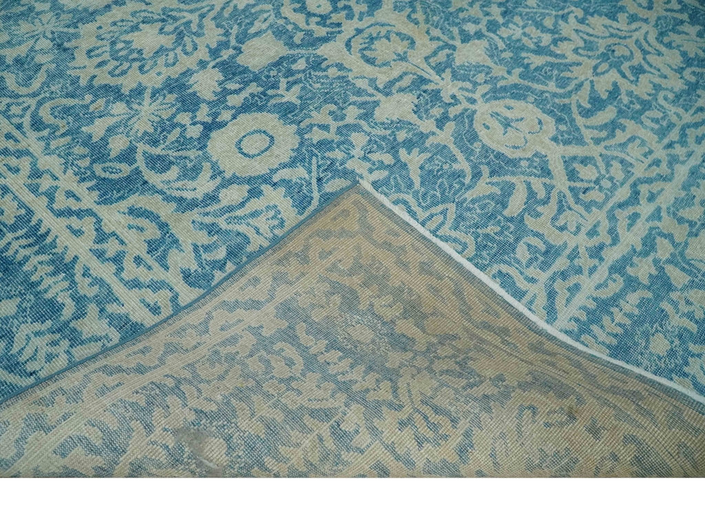 8x10 Blue and Camel Distressed Finish Low Pile Traditional Hand Knotted Wool Rug