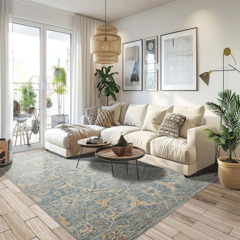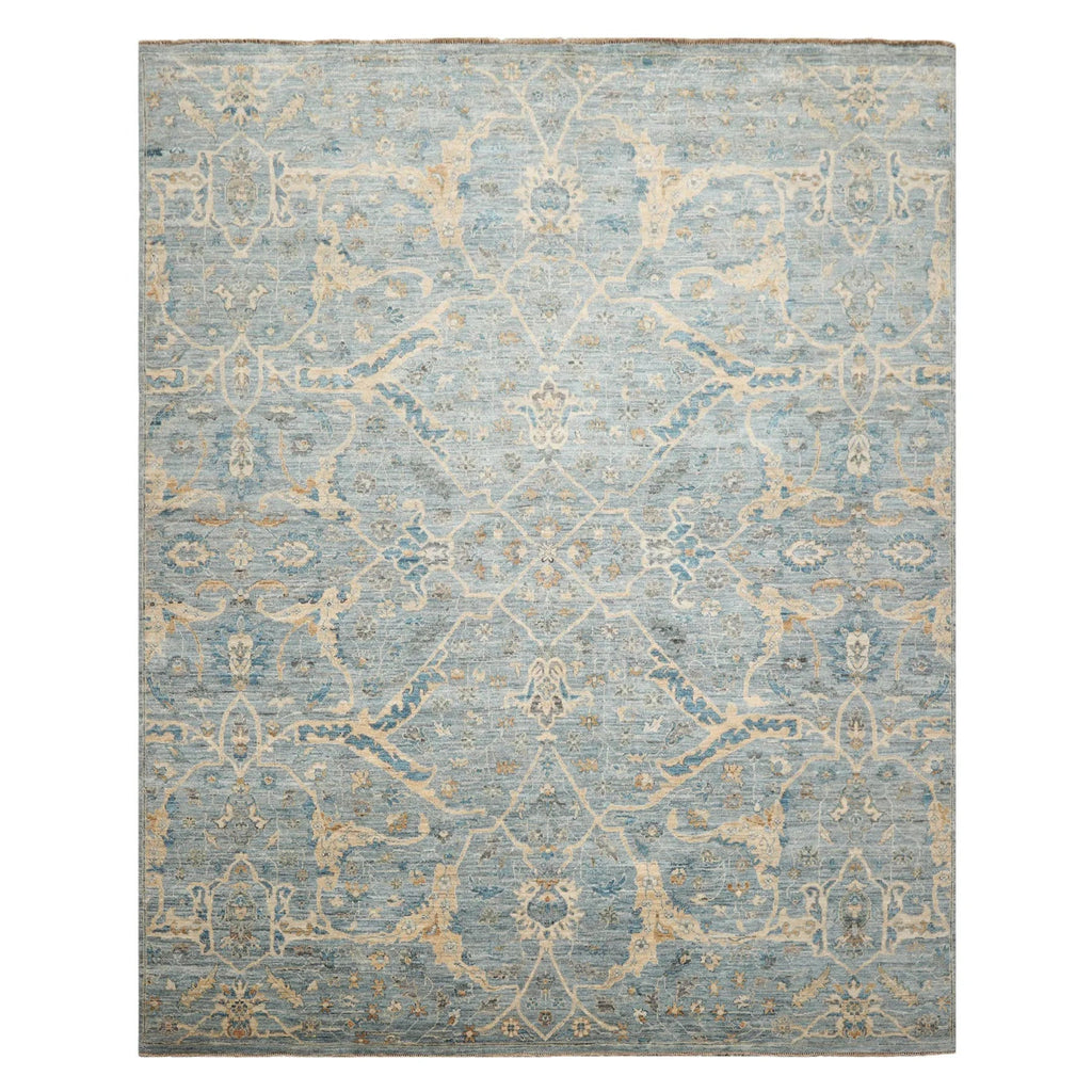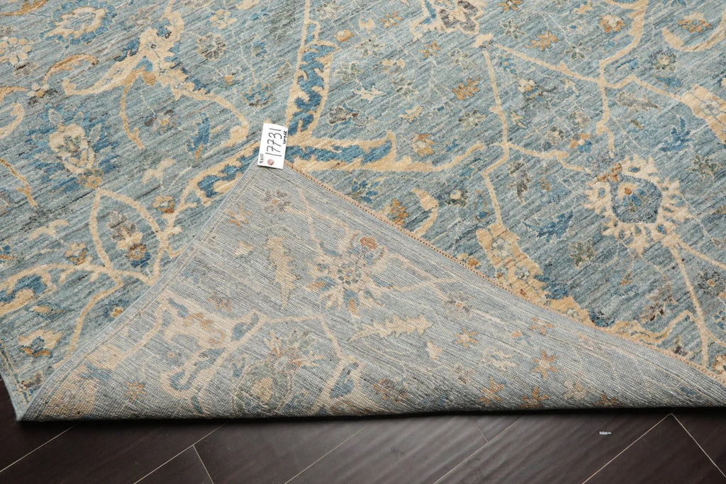 The rug before you embodies the exceptional texture inherent elegance and large-scale designs of traditional pieces reimagined for contemporary décor needs. Celebrating time-honored weaving techniques and artistry this fusion rug presents an elegant symphony of style and a trendy color palette. It features a harmonious interplay of blue beige aqua & peach adding depth and richness to the design and infusing it with a natural organic appeal. Whether placed in a living room dining area or bedroom this Oushak rug is poised to enhance any space with its timeless beauty and exquisite craftsmanship.
