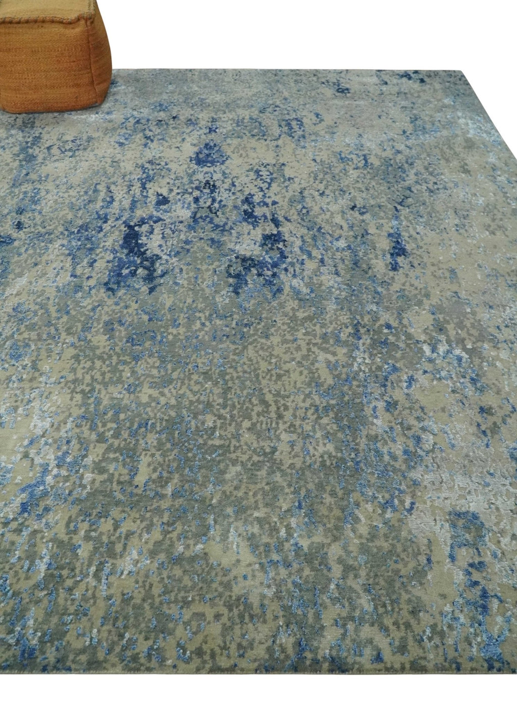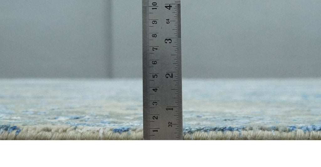 This beautiful Luxury Hand-knotted Area Rug is expertly crafted using a blend of wool and silk, featuring an abstract pattern of Blue, Ivory and Beige. It is crafted in the Indo-Tibetan style, featuring a fine hand-spun bamboo silk for a soft and luxurious finish. Perfect for any home.