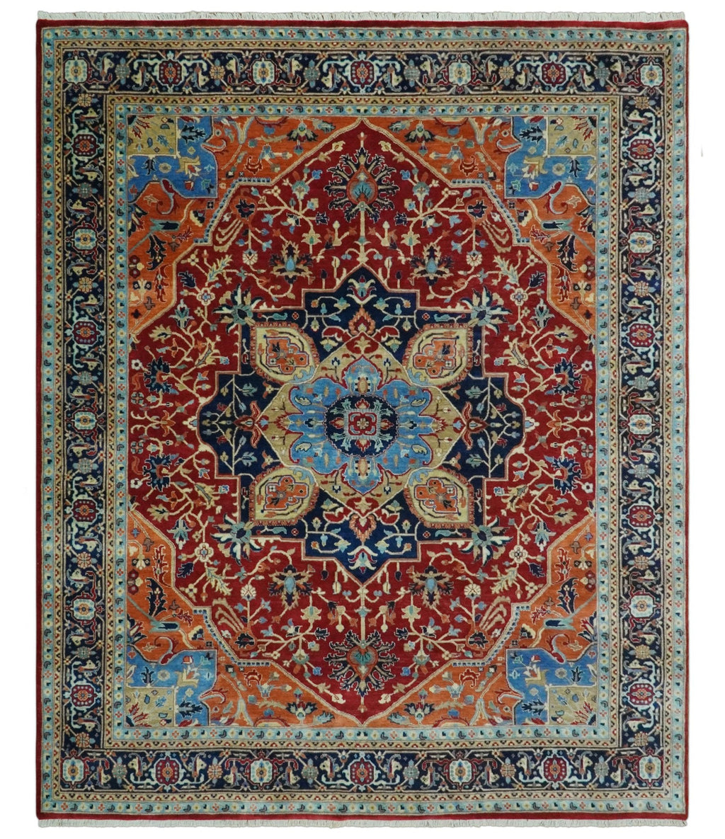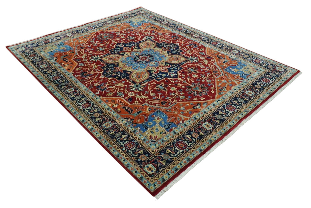 This 8x10 traditional Heriz Medallion wool area rug is hand-knotted for a fine, high-quality finish. With rust and blue tones, it adds a touch of elegance to any space. Made from durable wool, it's the perfect blend of style and functionality.