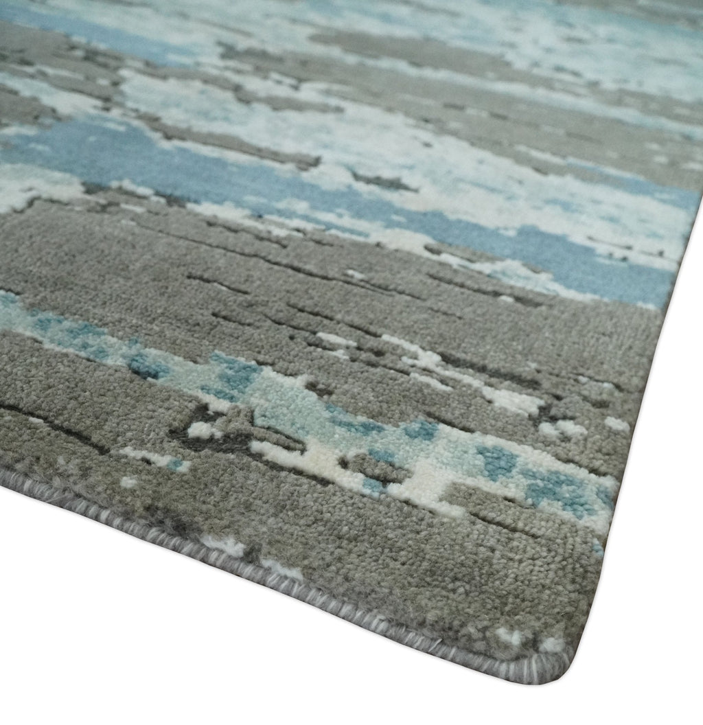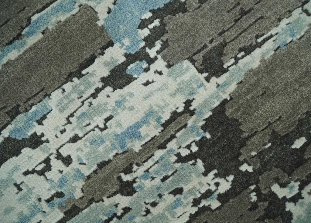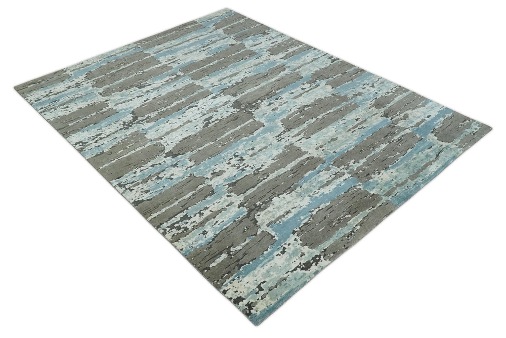 This 8x10 Hand Knotted Traditional Abstract Wool Area Rug is a perfect choice for living rooms, bedrooms, and kids' rooms. Its charcoal, ivory, and aqua colors create a warm and inviting atmosphere, crafted from high-quality wool with a beautiful abstract design. Ideal for any room in the home.