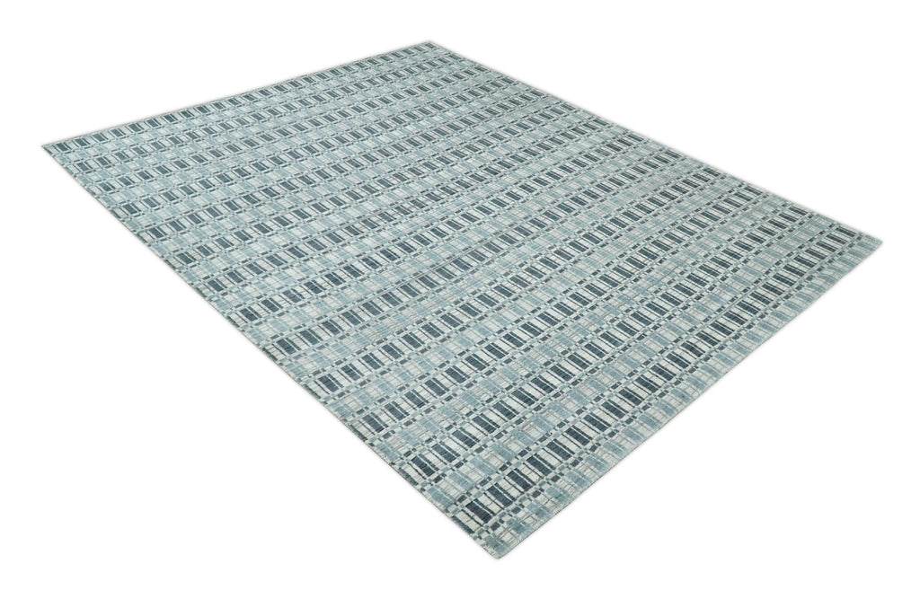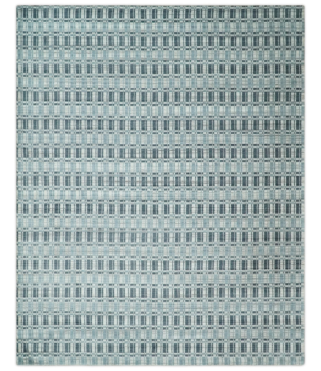 8x10 Hand Made Checkered Beige, Blue and Charcoal Scandinavian Blended Wool Flatwoven Area Rug | KE30