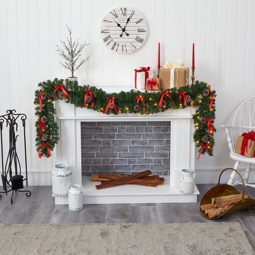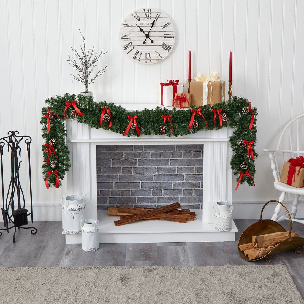 Complete your holiday decor scheme with this artificial winter garland, intricately designed from realistic looking foliage in a palette of seasonal evergreens and accented throughout with faux pinecones that look incredibly lifelike and decorative bows - all to help evoke the Christmas spirit. Great for showcasing over a mantle, bare counter, or stair banister, this festive 9’ long artificial garland will undoubtedly complete a traditional holiday setting for years to come.