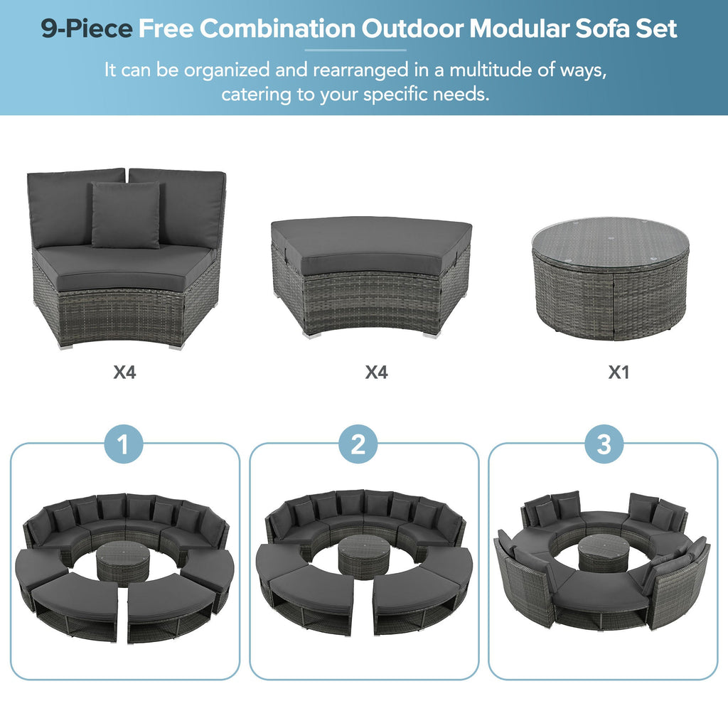 - Flexible Combination - This patio sofa set includes 8pcs sofa and 1pc round table. It can be organized and rearranged in a multitude of ways, catering to your specific needs. The modular design allows you to arrange the tables and sofas in the best way to suit your garden, whilst maintaining the social element.