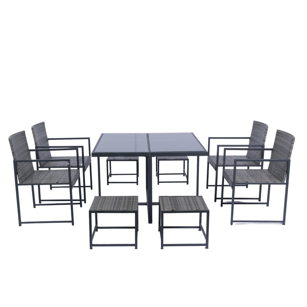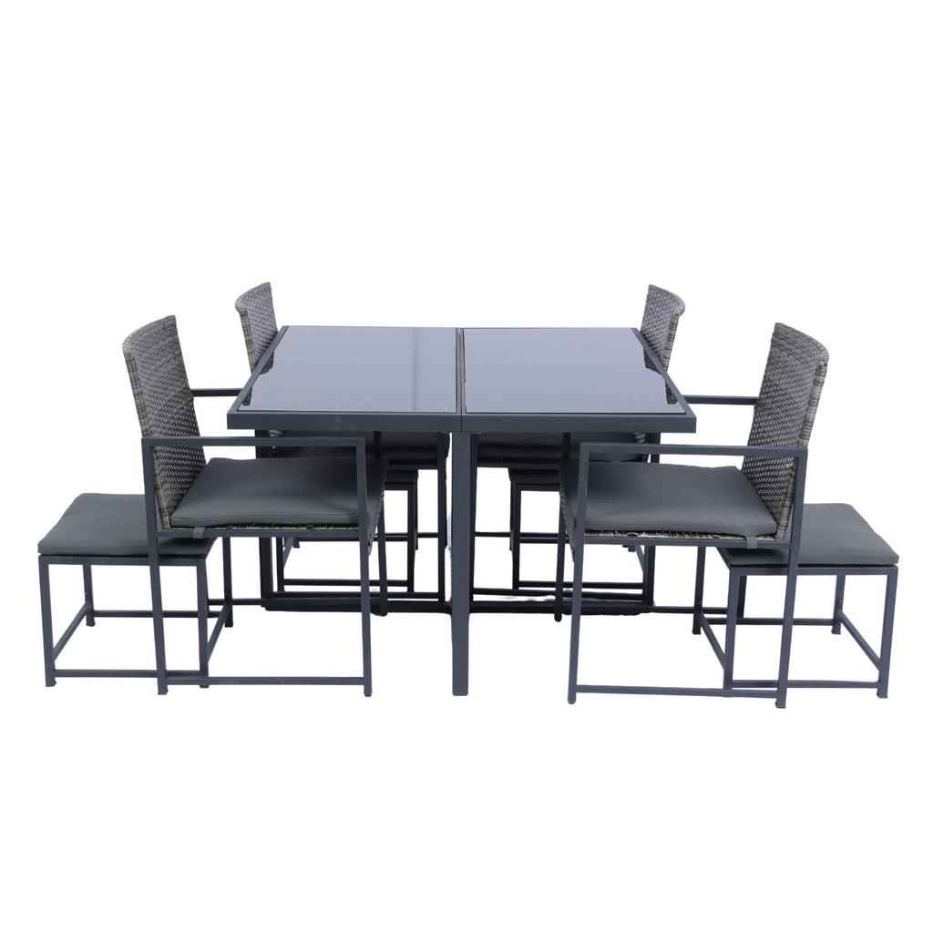 - SPACE SAVING DESIGN : For all of the chairs, their backs are foldable so that cushions can be stored inside.By tucking stools under the chairs, the whole seatings will be put underneath the tabletop for space-saving when not in use.