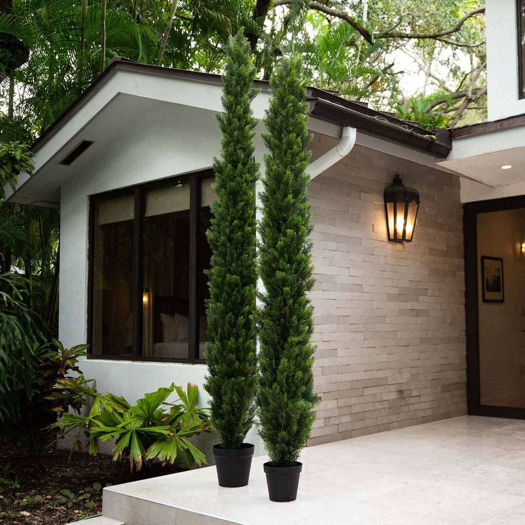The cedar, a bestseller inspired by the lush forests of the Pacific Northwest, offers a maintenance-free, lifelike presence. Tall and leafy, these trees boast a large silhouette that will impress in any indoor or outdoor space. The flexible branches allow for a customized look. At a striking 9' from a nursery planter, this tree suits any setting and transitions smoothly from holiday charm to summer elegance. For an elevated, clean entrance, place one on each side of your front door.