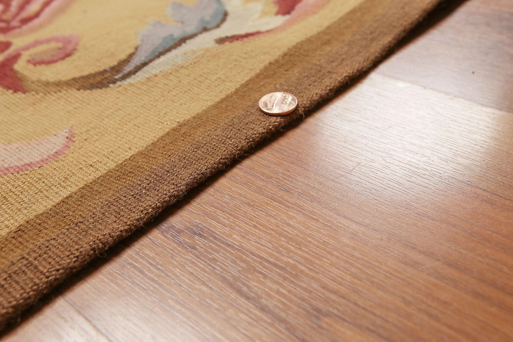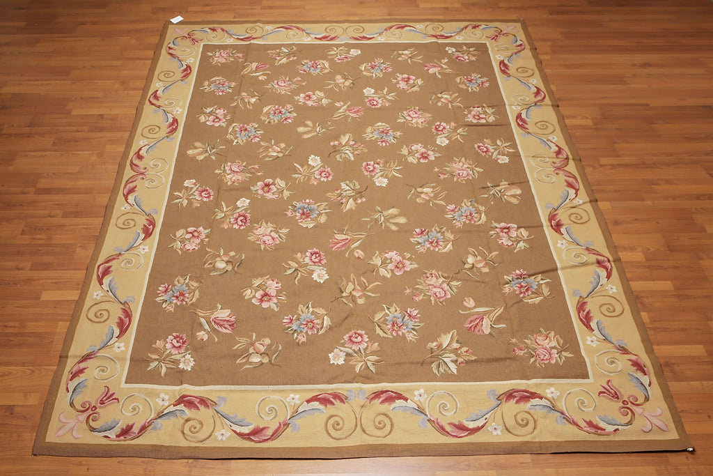 This is a beautiful Brown Gold Rose, Pink, Blue, Multi Color Hand Woven Needlepoint Aubusson Wool Rug. Its elegant style is easy to decorate with and perfect for living room, dining room, bedroom or anywhere in the residence or office. This Aubusson is 100% wool in thin pile. Rugs and tapestries were made famous during 14th and 15th century and were made in Aubusson, a small medieval town in France. The rugs have motifs in traditional design. During 1930s tapestry was made popular by artists such as Cocteau, Dufy, Dali, Braque, Calder and Picasso who were invited to Aubusson to express themselves through the medium of wool.