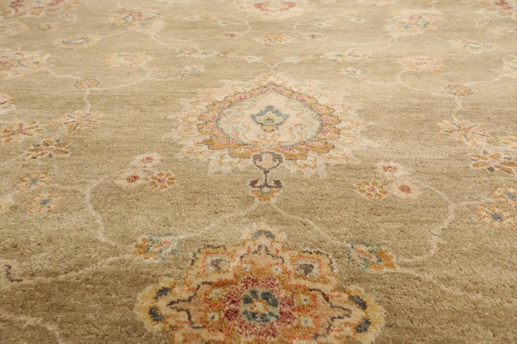 Cosmopolitan and sophisticated, the rug features bold arabesque floral and botanical motifs on the main field encompassed by a sumptuous main border enclosed within the vine and scroll minor borders. This rug representing an illustrious legacy of exquisite artistry and the intricate craftsmanship is primed to add visual glamor and class to its surroundings. Its soft texture and timeless design make it ideal to enhance any space where it is placed.