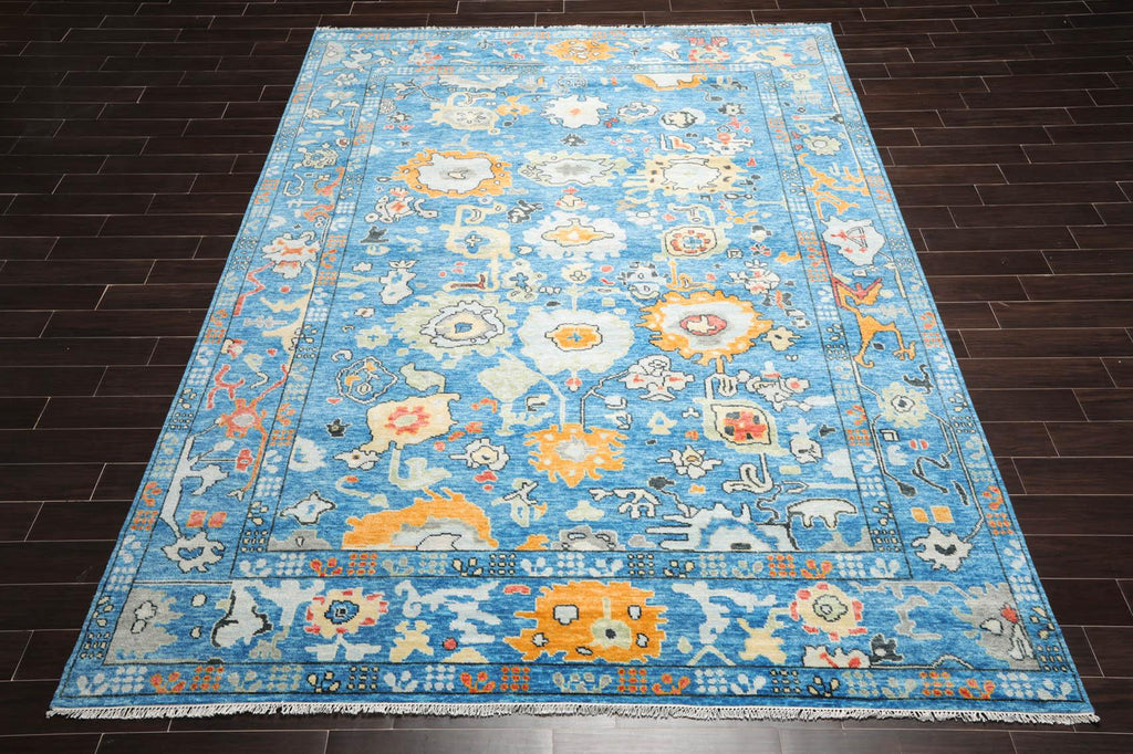 It has been produced using an identical weaving method and the design repertoire of the original Turkish Oushaks. Cosmopolitan and sophisticated in look, the rug has been handcrafted by artisans to a flawless composition. The main field comprising highly stylized floral and botanical elements is encompassed by a handsome multi-band border. The design of the border compliments the inner field and adds gentle grandeur to the artful composition of the rug. This rug representing an illustrious legacy of exquisite artistry and intricate craftsmanship is primed to add visual glamor and class to its surroundings. Its soft texture and timeless design make it ideal to enhance any space where it is placed.