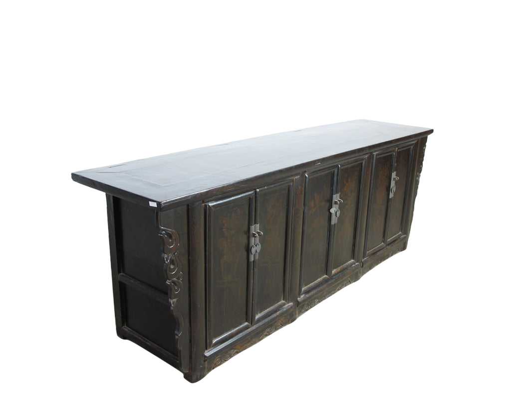 This late 19 century antique Chinese sideboard is a rare find. This gorgeous antique Chinese sideboard was retrieved from Shanxi Province. Beautifully hand carved boards flank both sides and apron the bottom. Faded painting adds aged depth and subtle beauty. Nice patina and rich texture that only can created by age adorn this buffet sideboard. It consists of 3 compartments with 2 shelve in each. This buffet sideboard cabinet is an outstanding show piece in living room, dining room, hallway, or study room. It adds a touch of Asian charm, beauty, and history to any space.