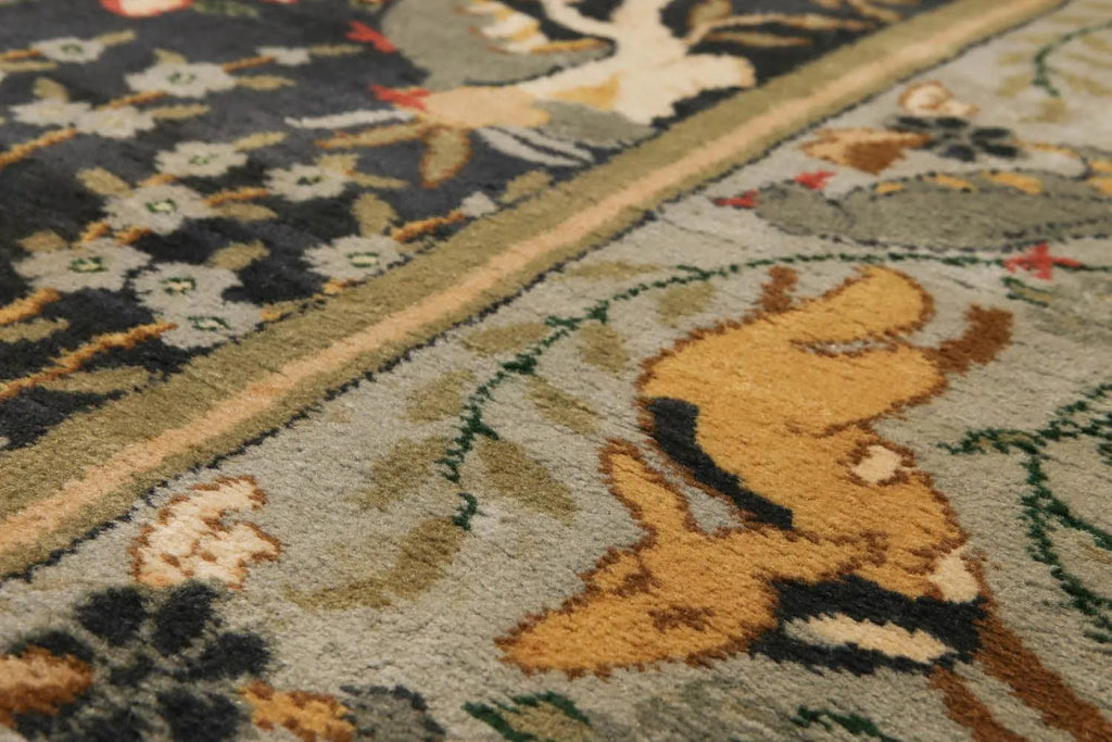 This extremely rare 8’1” x 11’7” rug is a made in Spain antique dating to early 1800s. Crafted of single-warp Spanish knot, the rug is the finest representation of Iberian tradition of vine scroll ornamentation and distinctive pictorial elements. Made from soft wool on silk foundation, the rug is durable and truly an heirloom artifact meant for posterity. Rug’s nature inspired color palette of charcoal, sage, brown, gold, beige and coral goes lighter or darker with given lighting and differing angles of views. In extraordinary health for its age, the rug has no holes, rips, tears or any structural damage like any low pile. Professionally cleaned, ready to use.