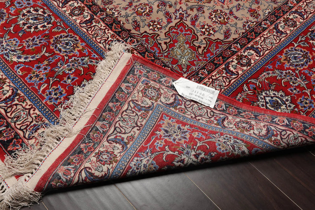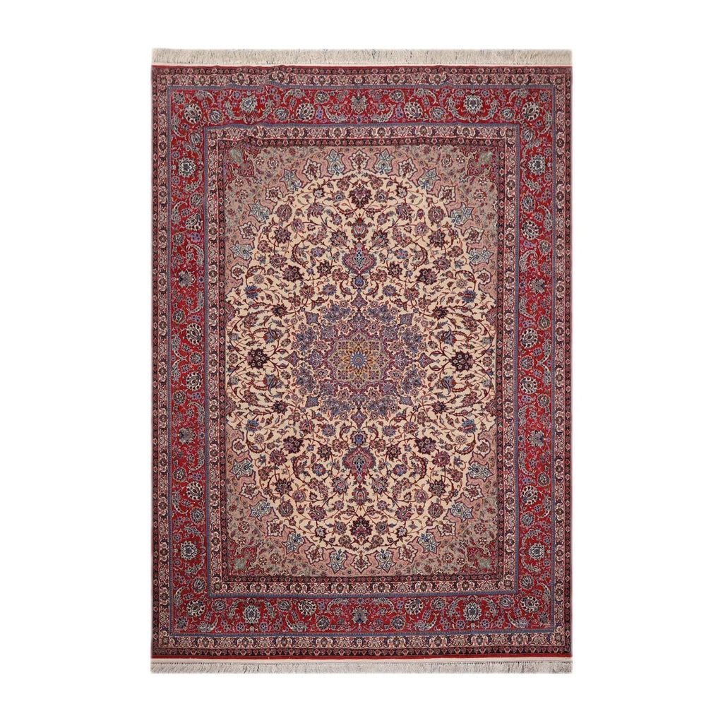 This is another gem from the Persian rugs' vast repertoire of artisanal rugs. This rug represents the finest of rug traditions in Iran. Made in its namesake city, the rug is a stunning composition of technique, craftsmanship and design. With 300 knots per square inch on silk foundation, the rug has been woven using the Persian knot. This knot allows for tight weaving that results in sharper, clearly defined rug design as well as improved longevity of the rug. The pile is a combination of high-quality wool and silk. The natural wool adds not only years to the rug, but also provides dirt-repellent qualities and thermal insulation. The silk, on the other hand, provides a unique shine to the rug which seems to transform when viewed from different angles. With a rich color palette, rug is a visual delight with an opulent medallion on an inner field decked with curvilinear floral motifs. The overall impression is one of uber sophistication, timeless beauty, and exquisite craftsmanship.