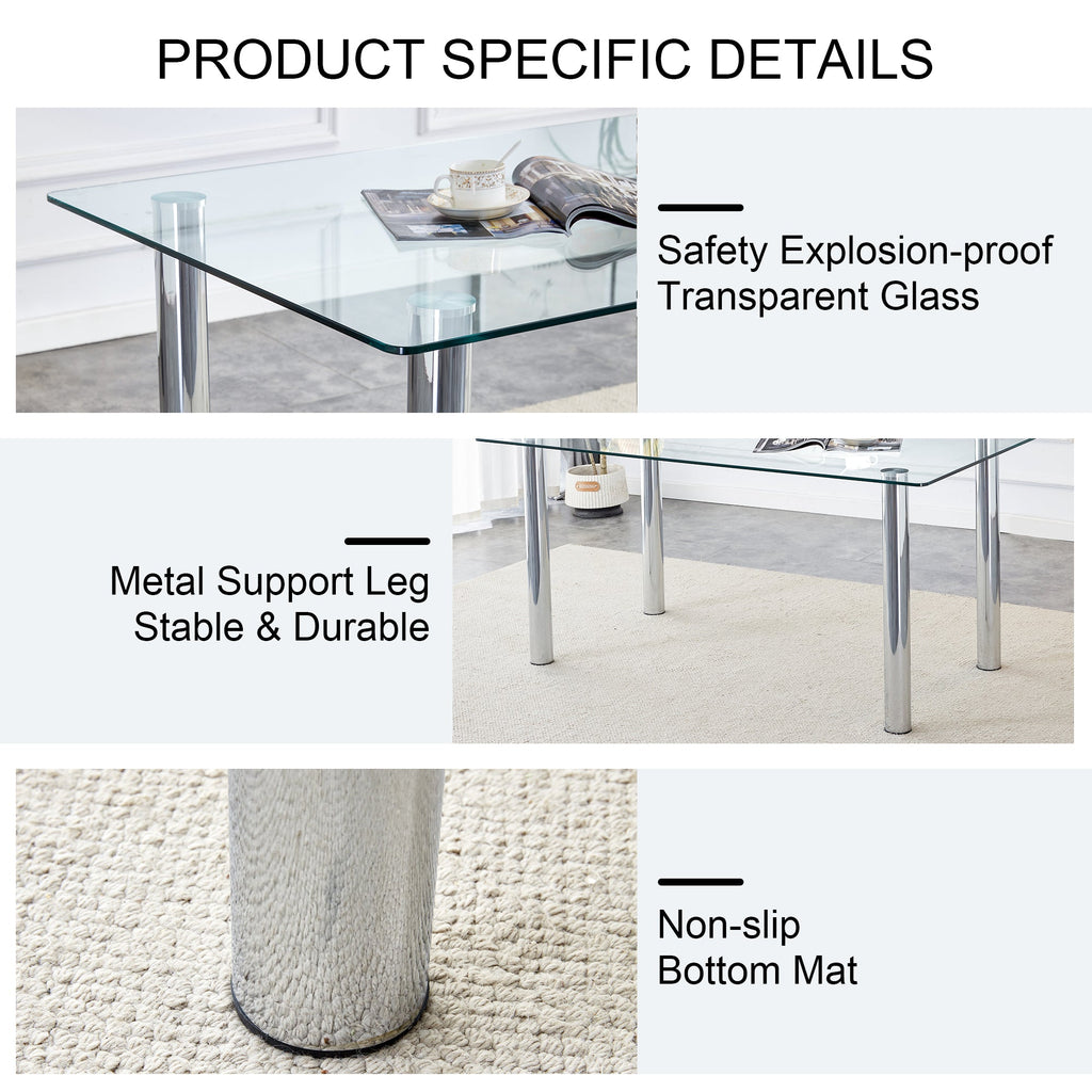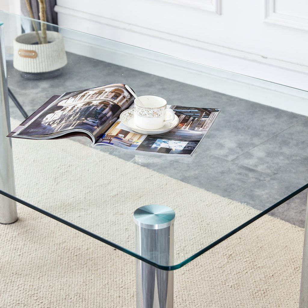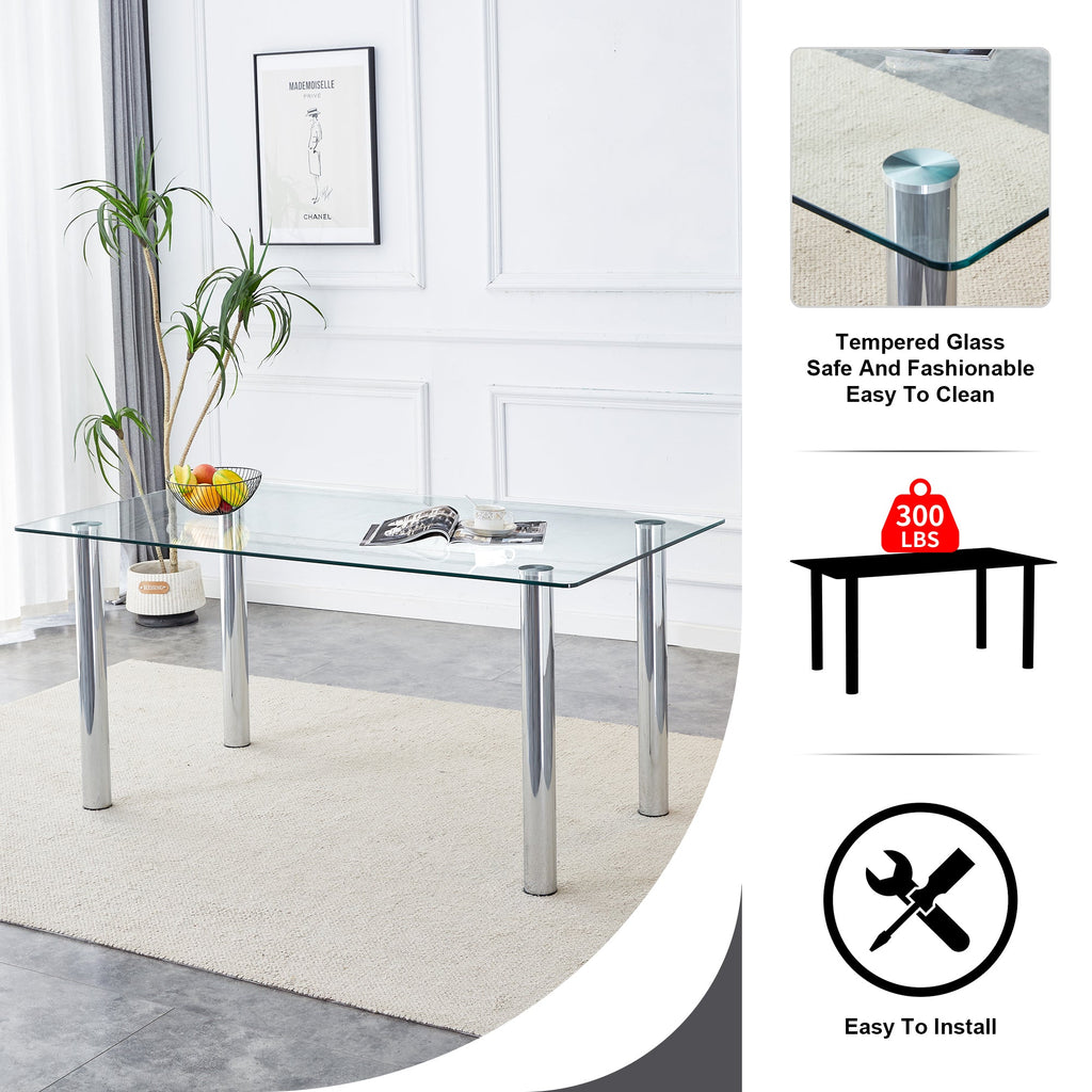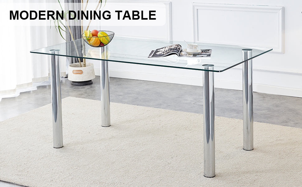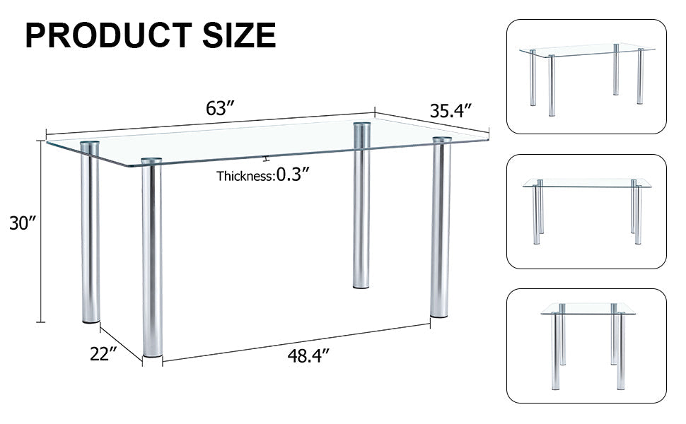 A modern minimalist style glass dining table. Transparent tempered glass tabletop with a thickness of 0.3 feet and silver metal legs. Suitable for restaurants and living rooms. 63 "x 35.4" x 30"