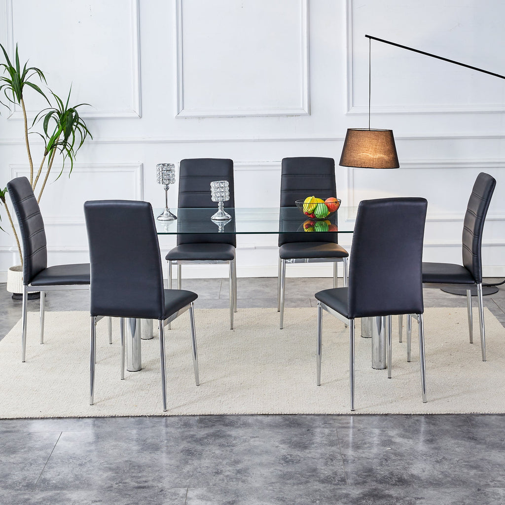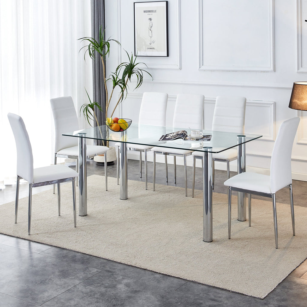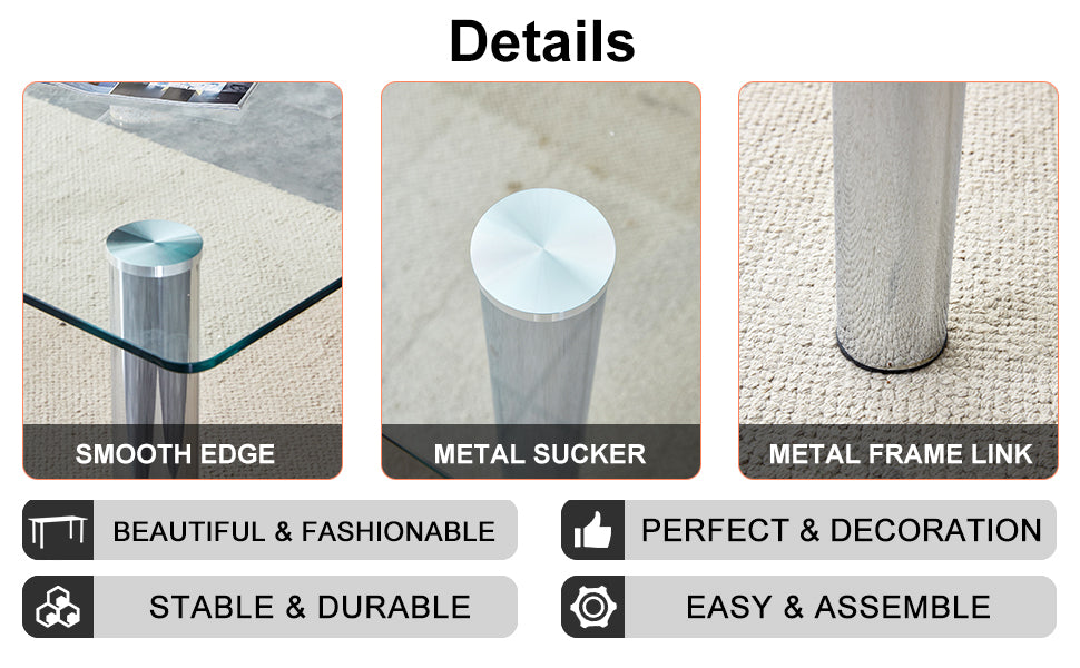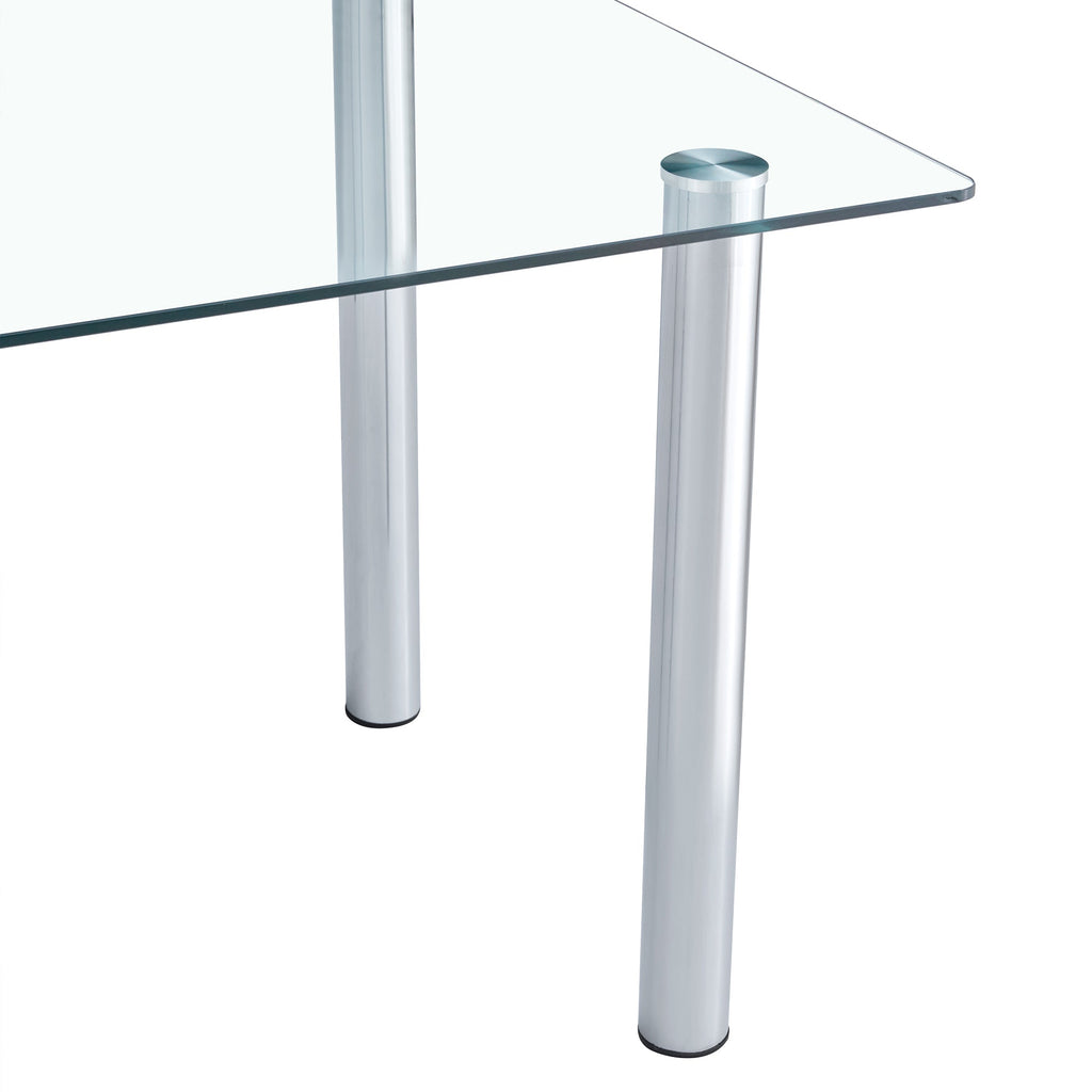 A modern minimalist style glass dining table. Transparent tempered glass tabletop with a thickness of 0.3 feet and silver metal legs. Suitable for restaurants and living rooms. 63 "x 35.4" x 30"