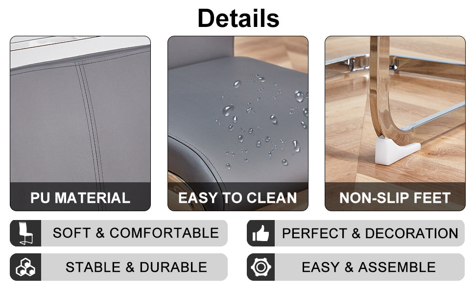• A simple dining table. A dining table with a white marble pattern. 4 PU synthetic leather high backrest cushioned side chairs with C-shaped silver metal legs.
