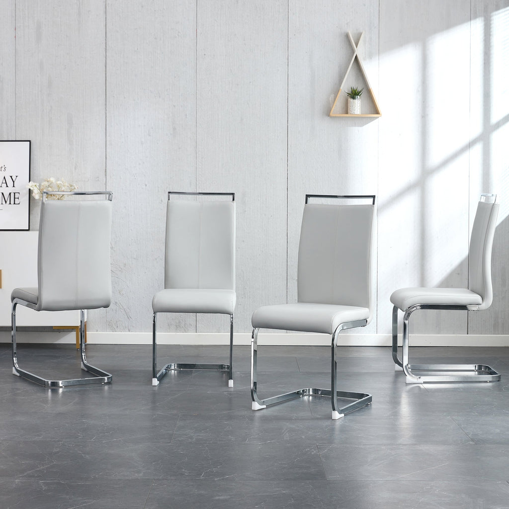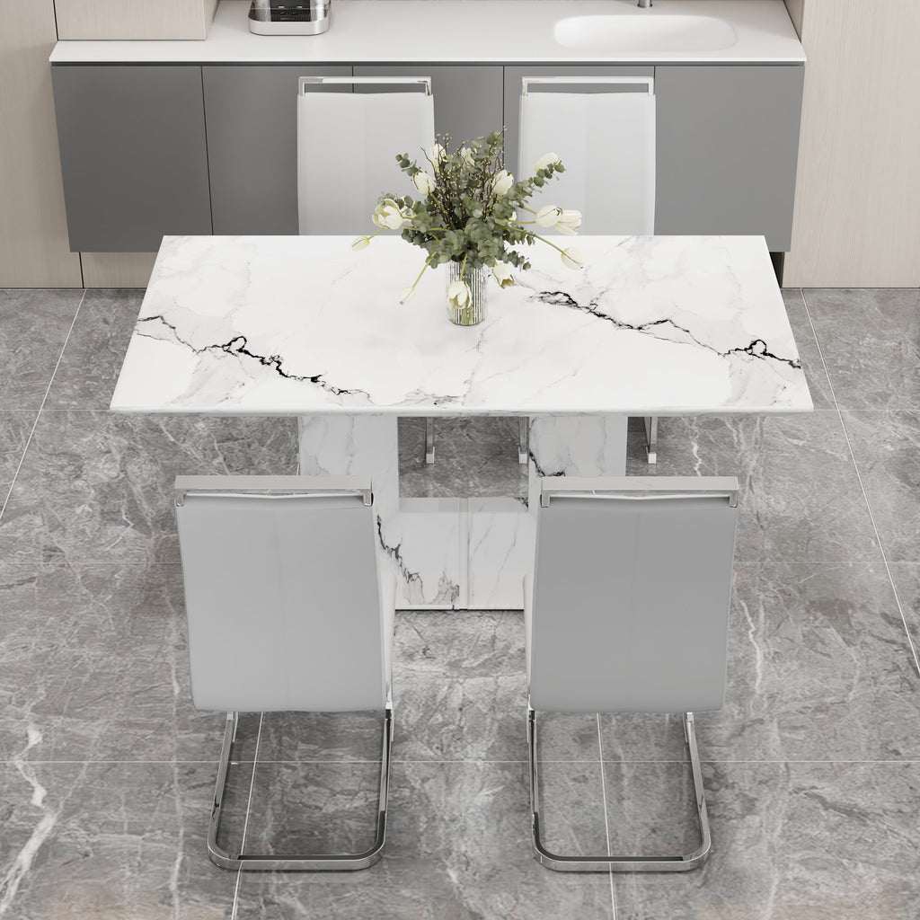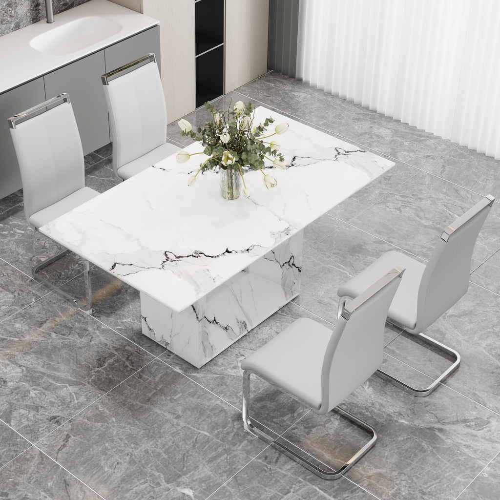 A simple dining table. A dining table with a white marble pattern. 4 PU synthetic leather high backrest cushioned side chairs with C-shaped silver metal legs. DT-SQ-16090-wh