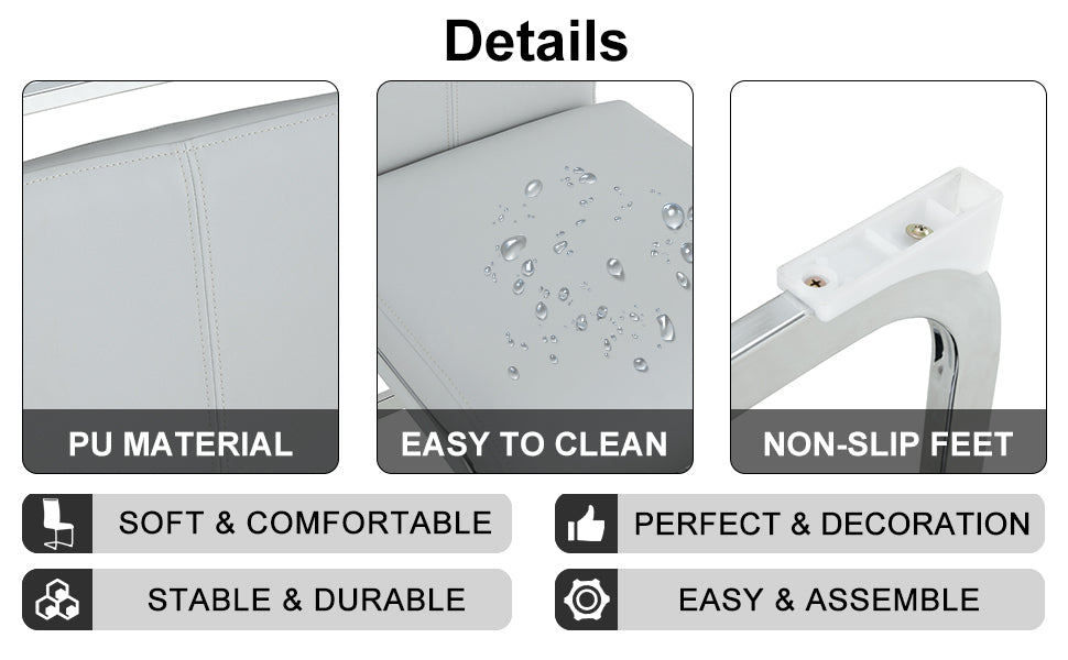 • A simple dining table. A dining table with a white marble pattern. 4 PU synthetic leather high backrest cushioned side chairs with C-shaped silver metal legs.