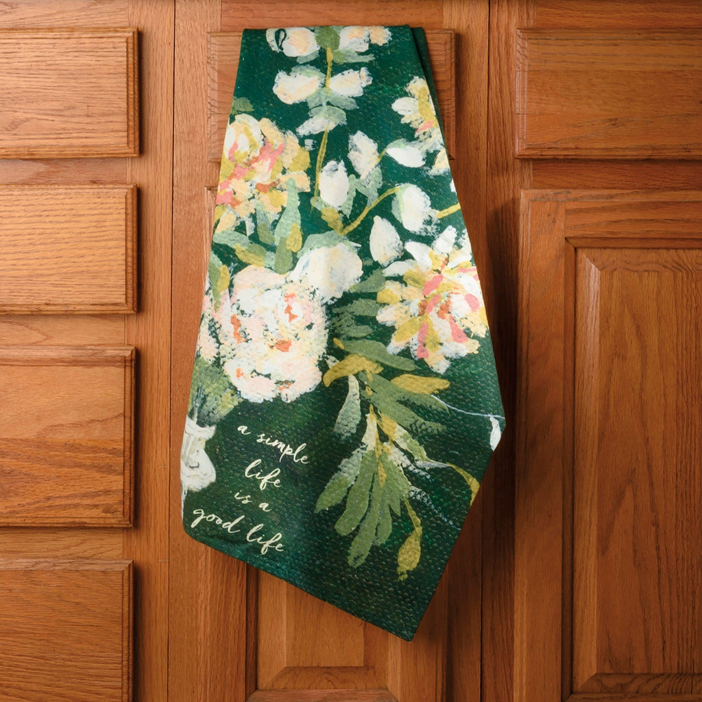 A cotton kitchen towel featuring an all-over watercolor floral design with hand lettered "A Simple Life Is A Good Life" sentiment.