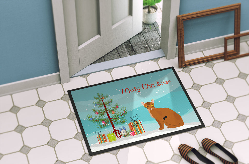 Decorate your space with our Christmas Abyssinian artwork on a Doormat. Welcome your guests in style with our Artwork Door Mat, designed to withstand almost any weather condition. This mat, measuring approximately 24 by 36 inches, is held together by durable black binding tape. Its top layer, composed of polyester felt, is dyed with the eye-catching image you see on the mat. A few layers below provide the mat with stability, while its rubber bottom is stamped to help prevent slipping and ensures safety. Our mat works wonderfully as both an indoor or outdoor door mat. For cleaning, simply hose it off with water or use a power washer - no need for any cleaner that produces suds. Avoid scrubbing with a brush, instead, opt for the vacuum on floor setting. Designed manufactured and printed in the USA, this mat is a perfect addition to your porch, outdoor kitchen, entryway, or any indoor space. Its unique design makes it a charming decorative rug that greets your guests and adds a stylish touch to your home decor.