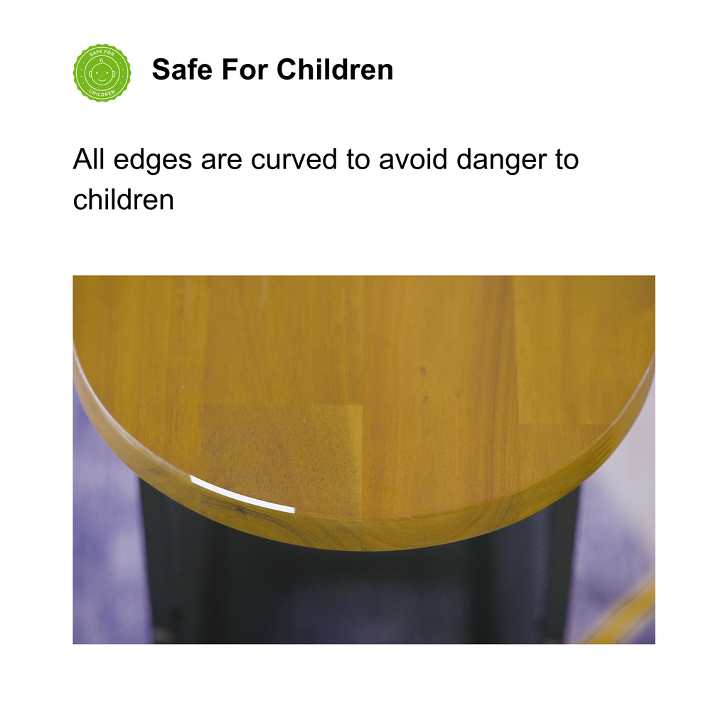 • Premium Materials - made from acacia wood combined with a powder-coated steel frame for sturdiness and durability. Oval table top with no sharp edges, which are curved to avoid danger to children.