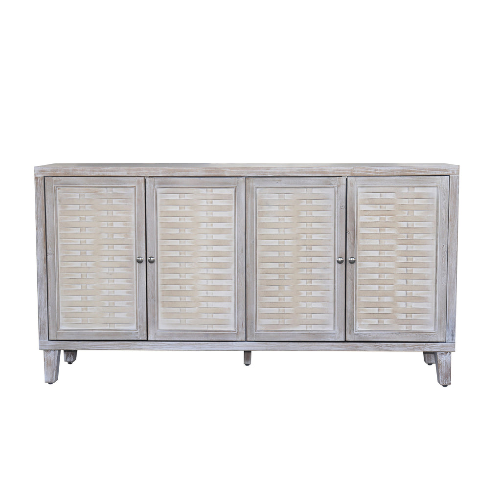 - The sideboard buffet cabinet combines practicality and ornamentation, featuring a shabby chic natural wood wash finish. The cabinet doors are adorned with weaving patterns and round metal handles, adding a touch of fashion and decoration to the interior space.