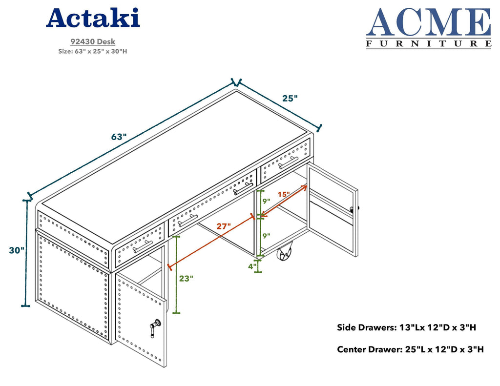 Romance : The industrial and classic design of the Actaki desk creates a spacious work area. The drawers maximize your space and your options in classic style, while keeping all your essentials neatly and safely tucked away. The gray finish and industrial style wheels, add a different look to any work space. Some Assembly Required.