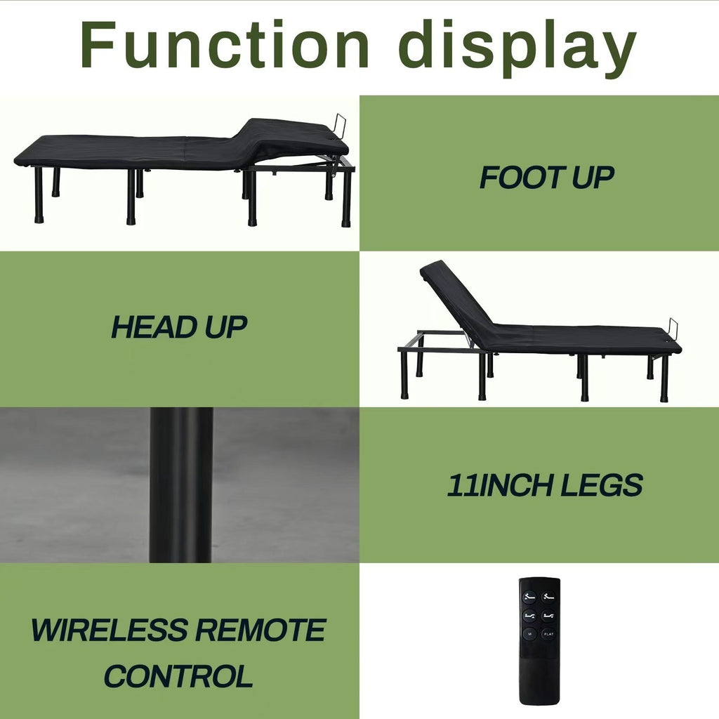 1.With separate Head and Foot Adjustable . Independent Head Adjust 0--60°, Independent Foot Adjust 0--40°. 2.Durable Steel Frame--Stable and not Shaky 3.11inch Legs--Anti-slip and noiseless 4.Mattress Retainer Bar--Keep mattress from sliding around 5.Adjustable Bed Frame--Separate Head and Foot Adjustable 6.Quiet Motor--Smooth & noiseless operation