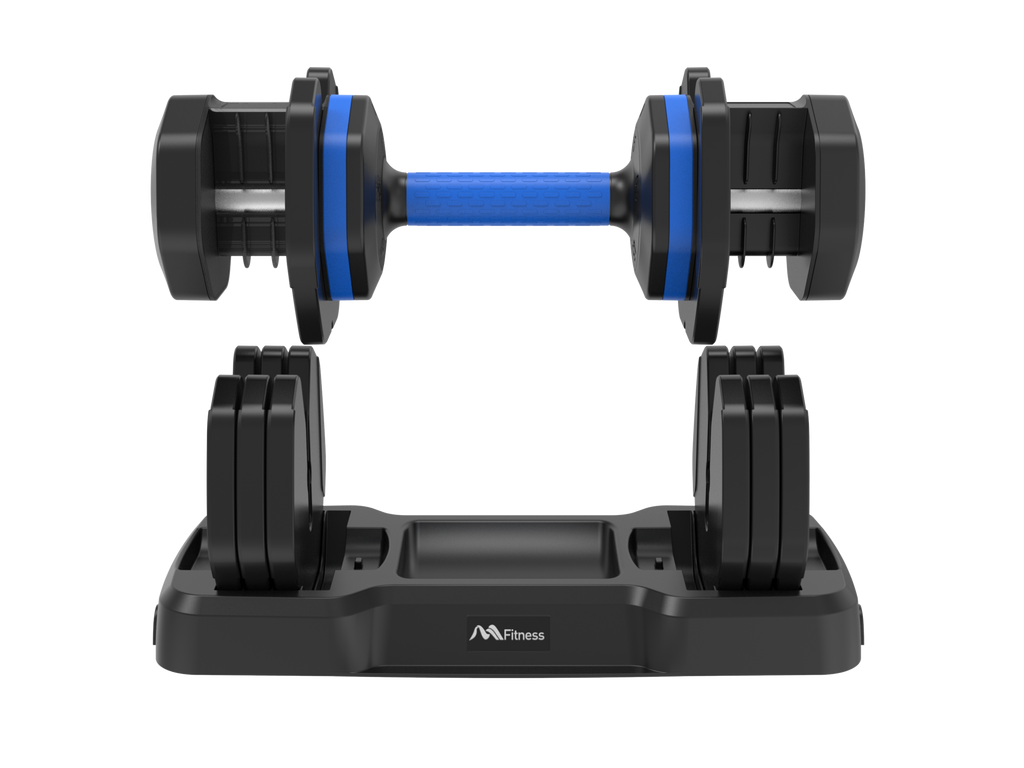 - This dumbbell set has a total weight of 55lbs for each one and it has 10lbs adjustable in each level. The user can simply put it on the included tray, and the safety lock will automatically be opened. Just simply rotate the non-slip handle, you can freely switch the dumbbells between five different gears of 15, 25, 35, 45, and 55 lbs. Lift the dumbbell and you can get the load you want. Different from the two-step adjustment on the market, this is a true one-key adjustable dumbbell. It saves you the space of the home gym while getting the most convenient access.