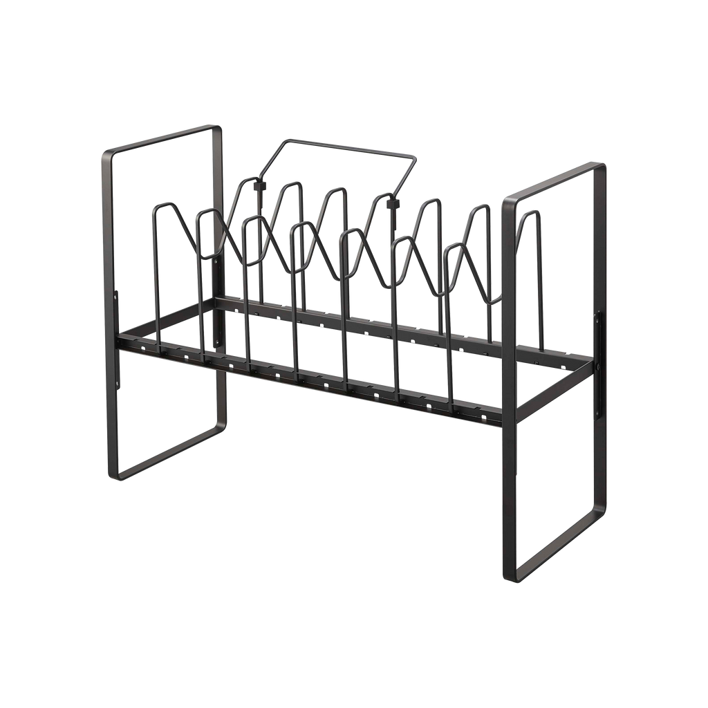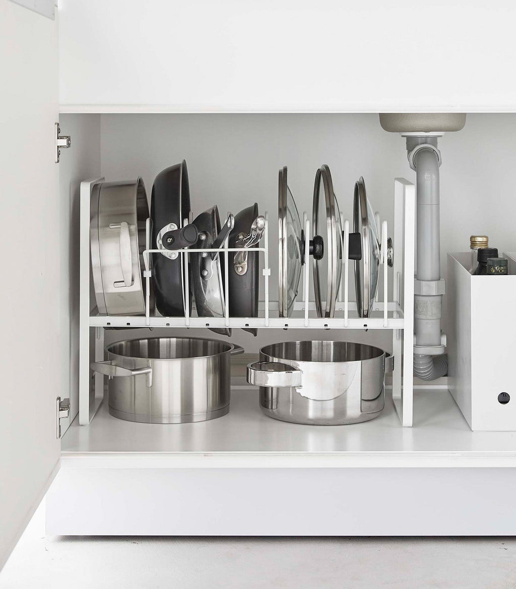 When it all *pans* out. Yes, a reasonable way to organizer your pots and pans does exist! Getting your cooking appliances neatly into your cupboard can feel like an impossible puzzle—but with this height-adjustable two-tier rack, you can store your pots, frying pans, and pot lids in a tidy manner that makes full use of your storage space. Choose between three height configurations and use the space on the bottom to store your pots and deeper pans. Store pot lids and frying pans vertically on the top tier, which features dividers that are also adjustable. There’s even a handy bar upon which pan handles can rest for optimal storage and easy access. Here’s to calm, chaos-free cabinets!