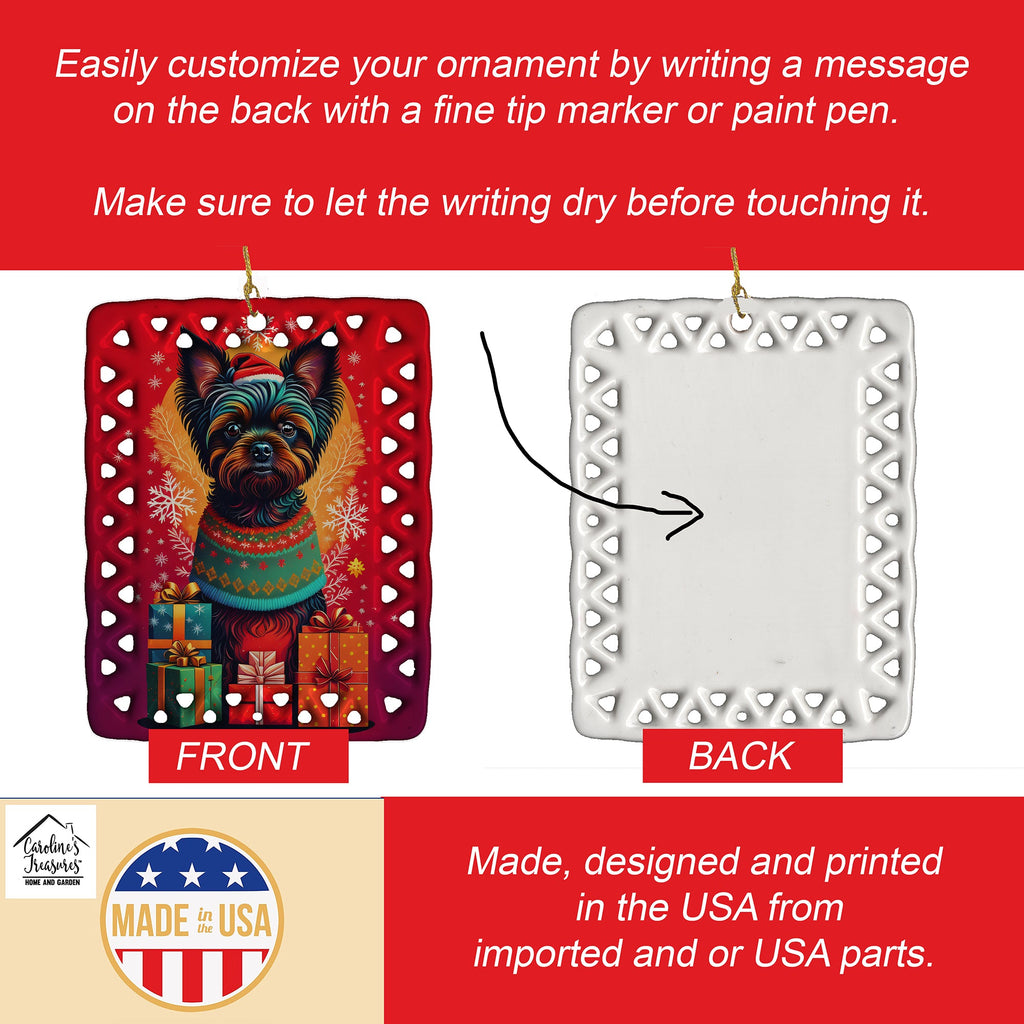 Porcelain Ornament featuring breed specific Affenpinscher artwork. Celebrate Christmas with this Christmas Ornament. Add a unique, personal touch to your holiday decor with our Rectangular Lattice Porcelain Ornament. Perfect for creating cherished memories, this high-quality ornament shines under festive lights, reflecting warmth and joy throughout your Christmas tree. Crafted with a glossy finish, it showcases vibrant, full-color artwork contributed by our talented artists, ensuring your tree is adorned with a burst of color and holiday spirit. What sets this Porcelain Ornament apart is its customizable white back. Use a paint pen or permanent marker to write a heartfelt message, commemorate a special year, or mark an unforgettable date, turning this ornament into a keepsake that will be treasured for years to come. For best results, allow any personalization to dry thoroughly before handling. Each ornament comes complete with a delicate gold cord, making it easy to hang and display. Proudly made in the USA, this ornament measures 3.375 x 2.625 inches and is a thoughtful gift for pet sitters, teachers, family members, or anyone who would appreciate a little extra holiday magic. Bring style, charm, and a touch of personal meaning to your Christmas tree with this beautifully designed ornament..