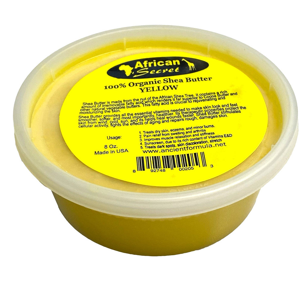 AFRICAN SECRET 100% organic Shea Butter - Smooth, shea butter is made from the nut of the African Shea tree. It contains a rich amount of irremovable fatty acid which renders it far superior to cocoa butter and other natural vegetable butters. This fatty acid is crucial to rejuvenating and moisturizing the skin. Shea butter Provides all the essential vitamins needed to make skin look and feel smoother, softer, and most importantly, healthier. Its therapeutic properties protect the skin from wind, cold, sun, and it helps heal wounds faster. Shea butter stimulates cellular activity, fights the effects of aging and repairs rough, damaged skin. SIZE: 8 Ounces.
