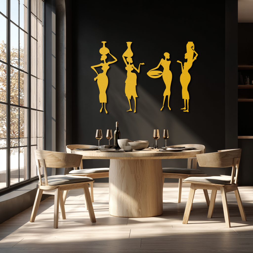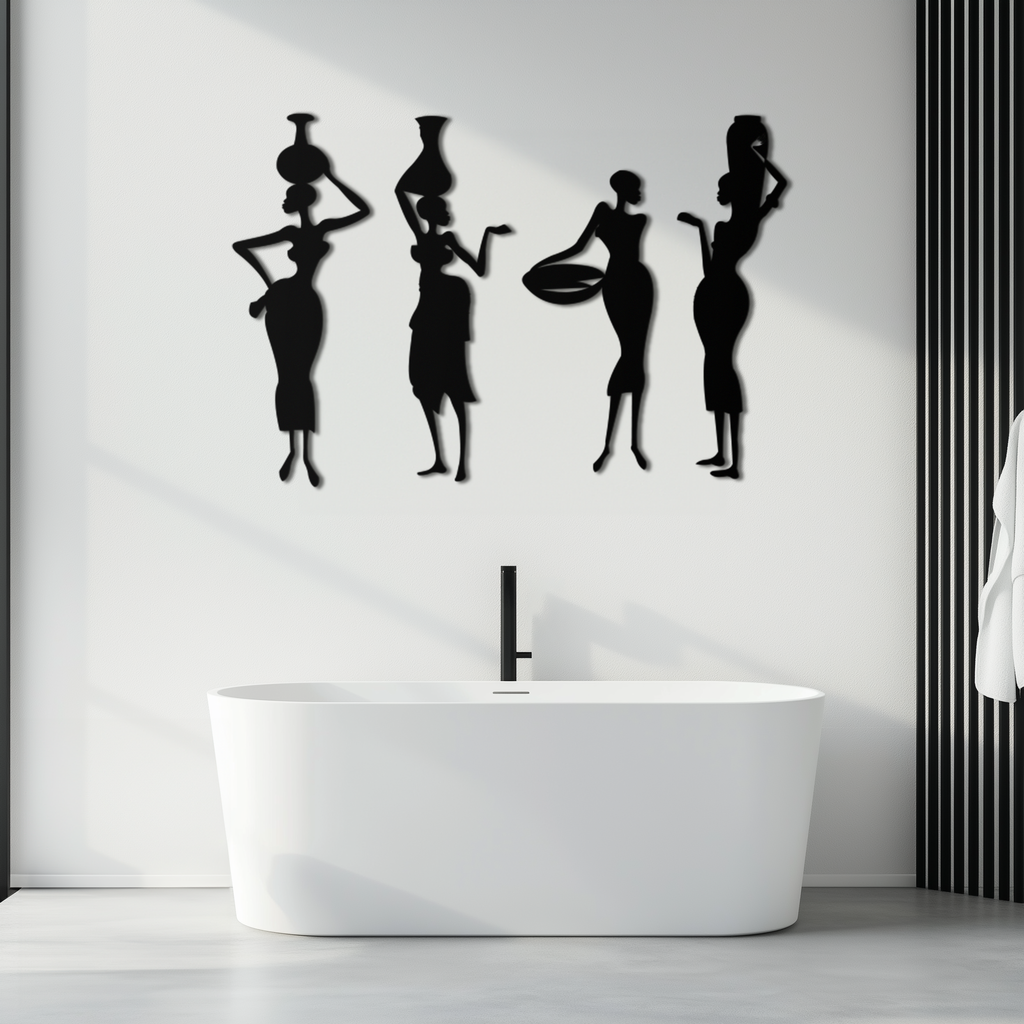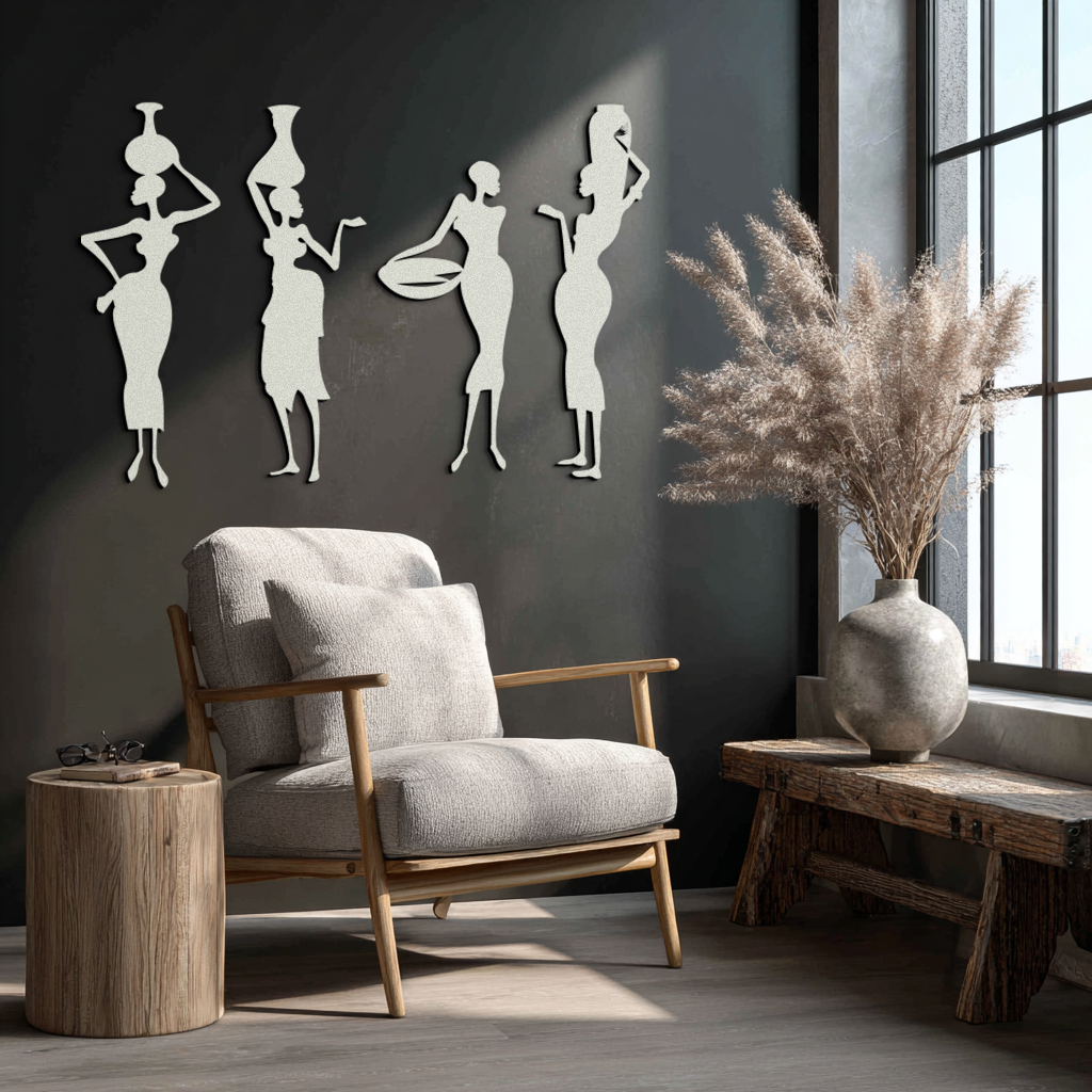 Bring cultural elegance and sophistication to your walls with this African Women Silhouette Metal Wall Art. This stunning 4-piece metal wall decor features graceful tribal women carrying traditional vessels and baskets, representing strength, grace, and beauty. Crafted from 1.5 mm premium steel and finished with electrostatic paint, this artwork is designed to resist rust and fading, ensuring long-lasting beauty.