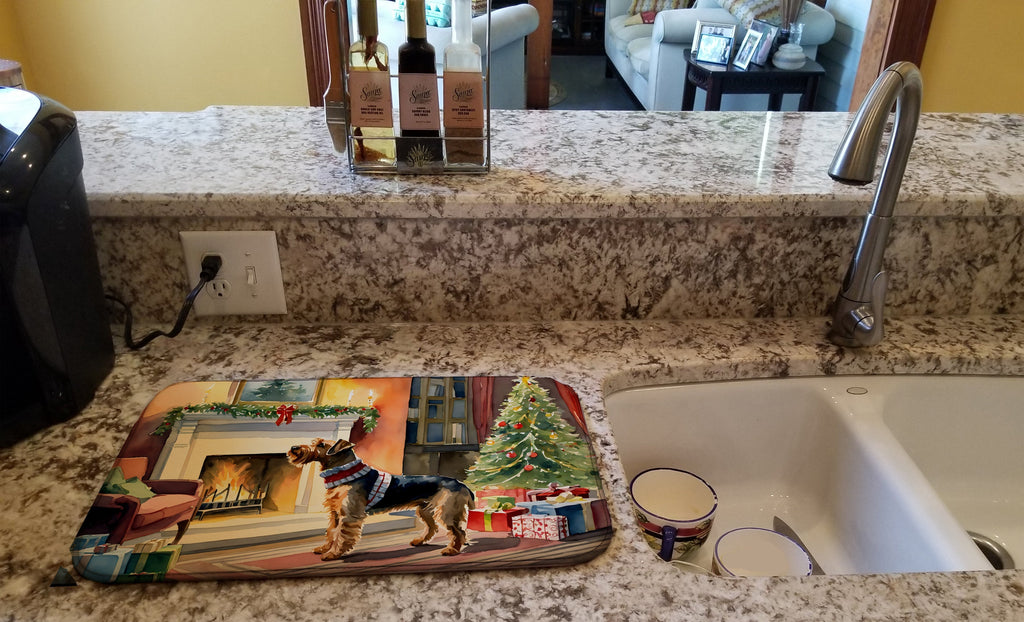 Dish Drying Mat featuring breed specific Airedale Terrier artwork. Celebrate Christmas with this Christmas Dish Drying Mat. Say goodbye to messy countertops and soggy dish towels with our innovative dish drying mat. Our high-quality dish drying pad is designed to keep your countertops dry while offering a stylish and efficient solution. Whether you're air drying dishes, glasses, stemware, silverware, pots, pans, bottles, or even fruits and vegetables, our dish mat is the perfect choice. The 14 inches x 22 inches size fits most counters and dish drying racks, and the non-slip design ensures stability. Made with water-absorbent polyester and a polyurethane foam insert, our dish drying mat is not only functional but also durable. It's machine washable and printed in the USA for long-lasting use. The beautiful artwork adds flair to your kitchen decor, making it a perfect housewarming gift or present for any occasion. Upgrade your kitchen experience with our absorbent and versatile dish drying mat.