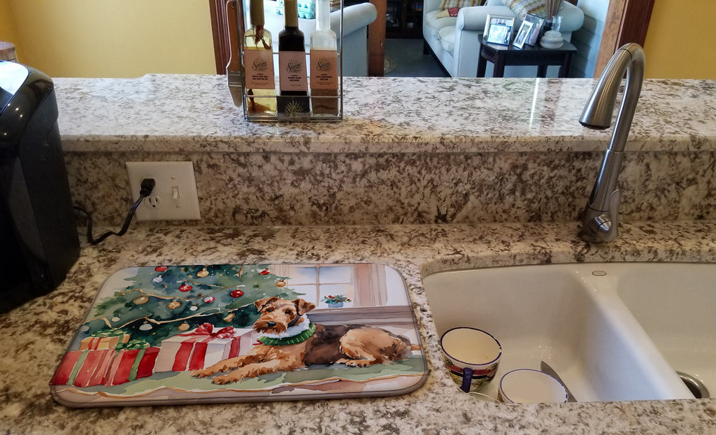 Dish Drying Mat featuring breed specific Airedale Terrier artwork. Celebrate Christmas with this Christmas Dish Drying Mat. Say goodbye to messy countertops and soggy dish towels with our innovative dish drying mat. Our high-quality dish drying pad is designed to keep your countertops dry while offering a stylish and efficient solution. Whether you're air drying dishes, glasses, stemware, silverware, pots, pans, bottles, or even fruits and vegetables, our dish mat is the perfect choice. The 14 inches x 22 inches size fits most counters and dish drying racks, and the non-slip design ensures stability. Made with water-absorbent polyester and a polyurethane foam insert, our dish drying mat is not only functional but also durable. It's machine washable and printed in the USA for long-lasting use. The beautiful artwork adds flair to your kitchen decor, making it a perfect housewarming gift or present for any occasion. Upgrade your kitchen experience with our absorbent and versatile dish drying mat.