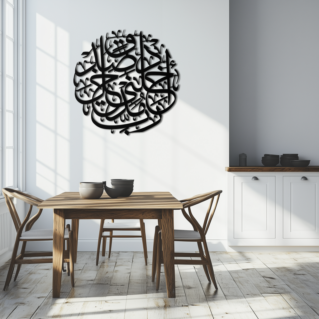 This calligraphy artwork is available in Black, White, Gold, Silver, and Bronze finishes, making it a perfect fit for modern, traditional, and Islamic-themed interiors. Whether displayed in a living room, prayer space, mosque, or office, this unique metal piece reflects both faith and sophistication.