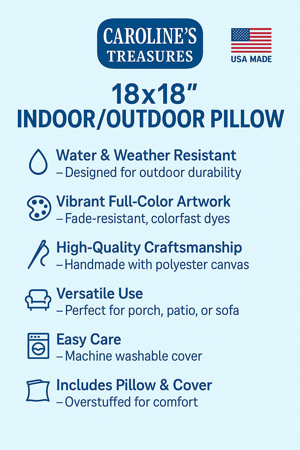Throw Pillow featuring breed specific Alaska Forget-me-nots artwork. Revitalize your outdoor or indoor living space with Caroline's Treasures 18x18 Fabric Decorative Pillow. With a generously sized dimension of approximately 18 inches by 18 inches, this pillow makes a comfortable and aesthetic addition to any seating area. Made from a unique, water-resistant material developed by Caroline's Treasures, the pillow sham is 100% polyester fabric that's durable and ready to weather any condition. Its vibrant, full-color artwork will not fade over time as it is dyed with color-fast dyes. Whether you place it on your patio furniture, porch, veranda, or indoor couch, its soft canvas fabric ensures a cozy experience. The pillow is handcrafted in the United States, featuring a sham created from three pieces of fabric and a polyester insert for enduring shape and overstuffed comfort. Despite being robustly built to endure the outdoors, it is as soft and snug as your favorite indoor cushions. Please note, as all our pillows are handmade, sizes may vary slightly, adding to the charm of this unique decorative item.