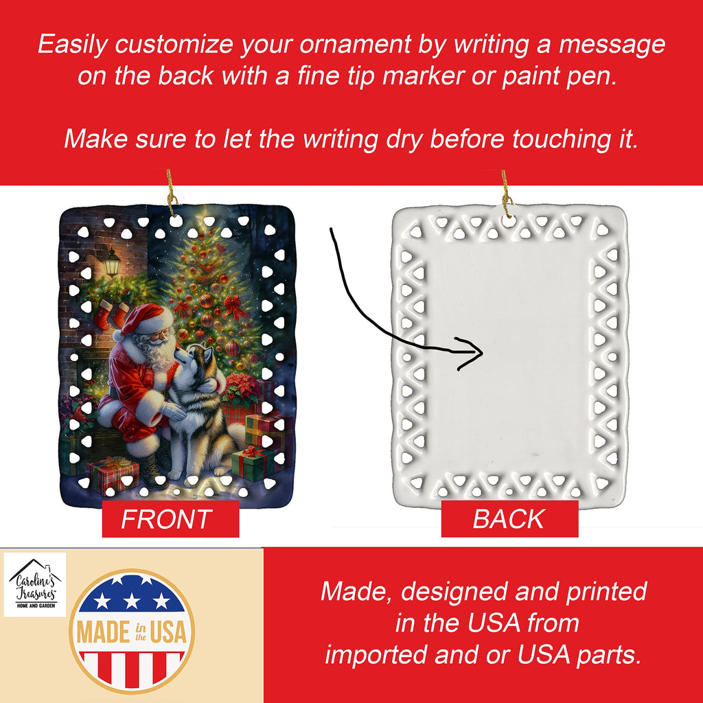 Porcelain Ornament featuring breed specific Alaskan Malamute artwork. Celebrate Christmas with this Christmas Ornament. Add a unique, personal touch to your holiday decor with our Rectangular Lattice Porcelain Ornament. Perfect for creating cherished memories, this high-quality ornament shines under festive lights, reflecting warmth and joy throughout your Christmas tree. Crafted with a glossy finish, it showcases vibrant, full-color artwork contributed by our talented artists, ensuring your tree is adorned with a burst of color and holiday spirit. What sets this Porcelain Ornament apart is its customizable white back. Use a paint pen or permanent marker to write a heartfelt message, commemorate a special year, or mark an unforgettable date, turning this ornament into a keepsake that will be treasured for years to come. For best results, allow any personalization to dry thoroughly before handling. Each ornament comes complete with a delicate gold cord, making it easy to hang and display. Proudly made in the USA, this ornament measures 3.375 x 2.625 inches and is a thoughtful gift for pet sitters, teachers, family members, or anyone who would appreciate a little extra holiday magic. Bring style, charm, and a touch of personal meaning to your Christmas tree with this beautifully designed ornament..