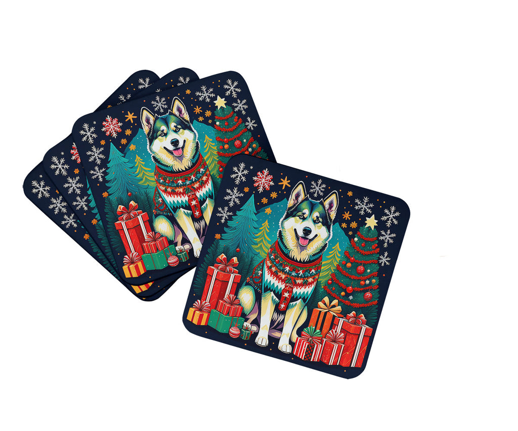 Decorate your space with our Christmas Alaskan Malamute artwork on a Coaster set. Presenting our Set of 4 Foam Coasters, a stylish and practical addition to your table setting. Each square coaster, measuring 3 1/2 inches by 3 1/2 inches, is perfectly sized to accommodate various drinkware, from coffee mugs to tumblers. These coasters stand out with their full-color artwork, permanently dyed onto the material for a vibrant and fade-resistant finish. They're not just functional, they're a fashionable statement, adding a touch of flair to any gathering or event. Our foam coasters serve a dual purpose - they protect your table from water stains and are perfect for both hot and cold drinks. The material used is similar to that of our high-quality mouse pads, ensuring durability and heat resistance. These coasters are easy to maintain - simply wash them in the top of your dishwasher and lay flat to dry. The design won't come off, ensuring they retain their vivid colors for years. Pair them with one of our insulated coolers or huggers for a cohesive, thoughtful gift set. Enhance your beverage experience with our Set of 4 Foam Coasters.