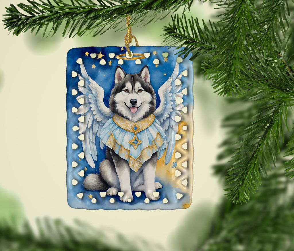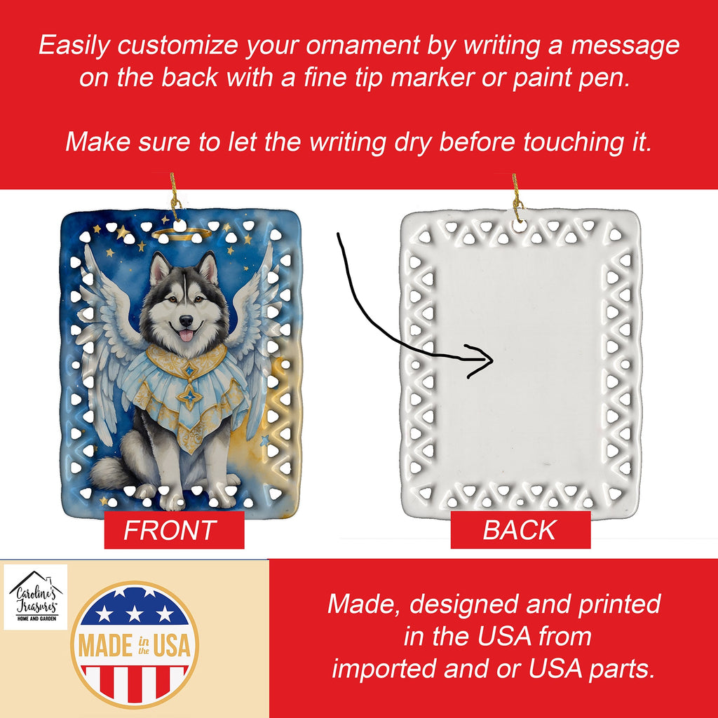 Porcelain Ornament featuring breed specific Alaskan Malamute artwork. Celebrate Christmas with this Christmas Ornament. Add a unique, personal touch to your holiday decor with our Rectangular Lattice Porcelain Ornament. Perfect for creating cherished memories, this high-quality ornament shines under festive lights, reflecting warmth and joy throughout your Christmas tree. Crafted with a glossy finish, it showcases vibrant, full-color artwork contributed by our talented artists, ensuring your tree is adorned with a burst of color and holiday spirit. What sets this Porcelain Ornament apart is its customizable white back. Use a paint pen or permanent marker to write a heartfelt message, commemorate a special year, or mark an unforgettable date, turning this ornament into a keepsake that will be treasured for years to come. For best results, allow any personalization to dry thoroughly before handling. Each ornament comes complete with a delicate gold cord, making it easy to hang and display. Proudly made in the USA, this ornament measures 3.375 x 2.625 inches and is a thoughtful gift for pet sitters, teachers, family members, or anyone who would appreciate a little extra holiday magic. Bring style, charm, and a touch of personal meaning to your Christmas tree with this beautifully designed ornament..